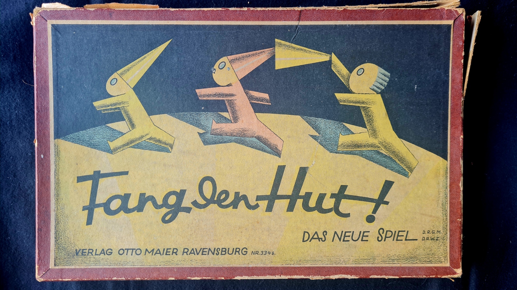 Als weitere Meilenstein in der Geschichte des Verlages kann die Veröffentlichung des Spiels Fang den Hut! ab 1927 angesehen werden. Bei dem Exemplar in der Spielsammlun handelt es sich um ein sehr frühe Ausgabe (NR.334b. DAS NEUE SPIEL), Schachteldeckel mit Beschädigungen, Hütchen sehr gut erhalten (jeweils 8 pro Farbe). Leider fehlen dir Hütchen der Farbe blau: