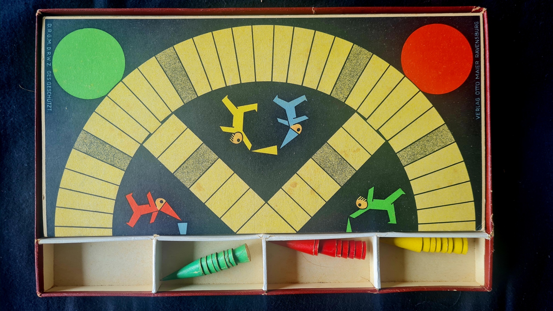 Das Sammlungsexemplar ist sehr gut erhalten; es fehlen offensichtlich nur die Originalwürfel (Zahl- und Farbenwürfel), sowie die Spielanleitung. Es stammt aus dem Familienbesitz von Verena und Claudio Edenhofer (Bad Reichenhall).