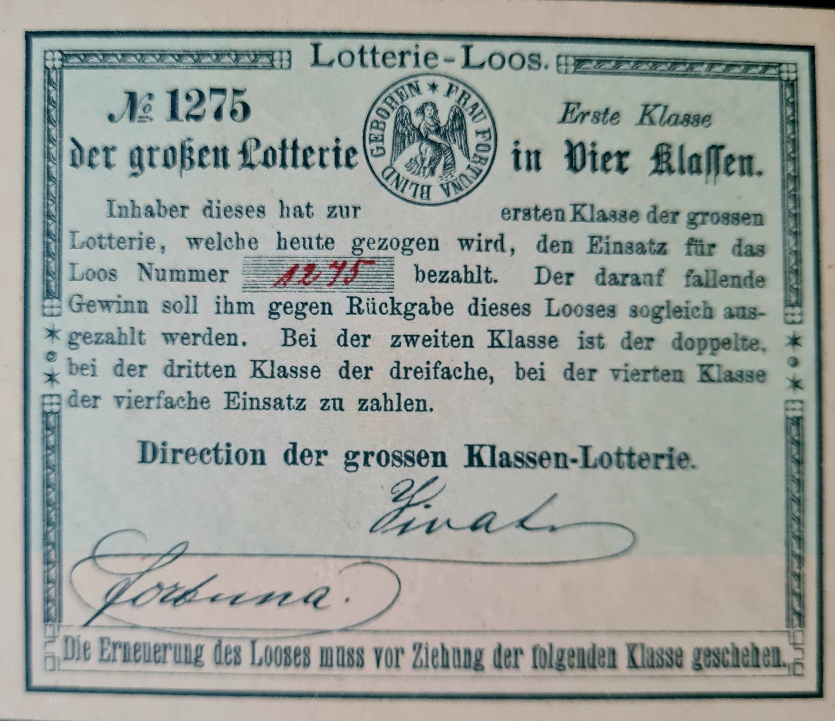 Sowohl das Logo als auch die Schreibweise von Lotterie-Loos bestätigen eine Entstehung vor 1900.