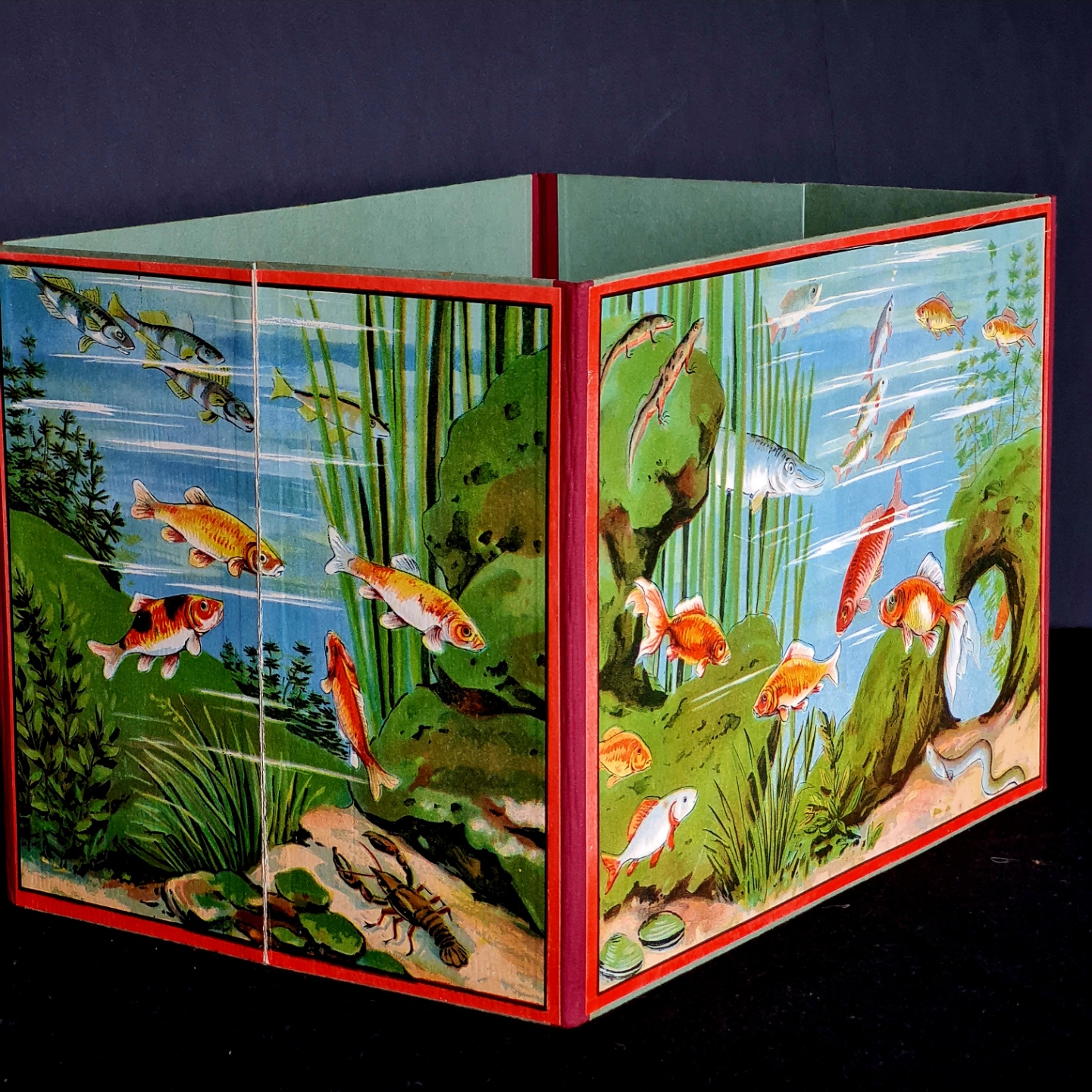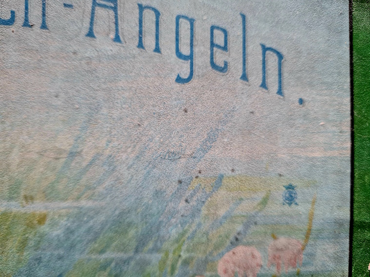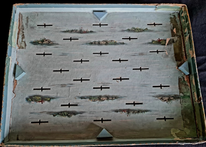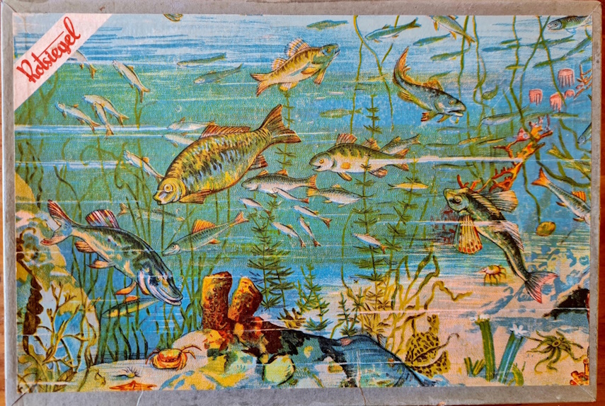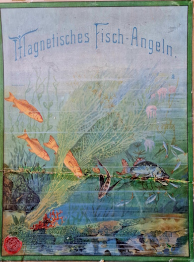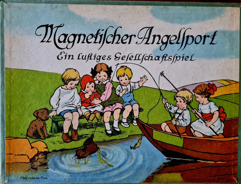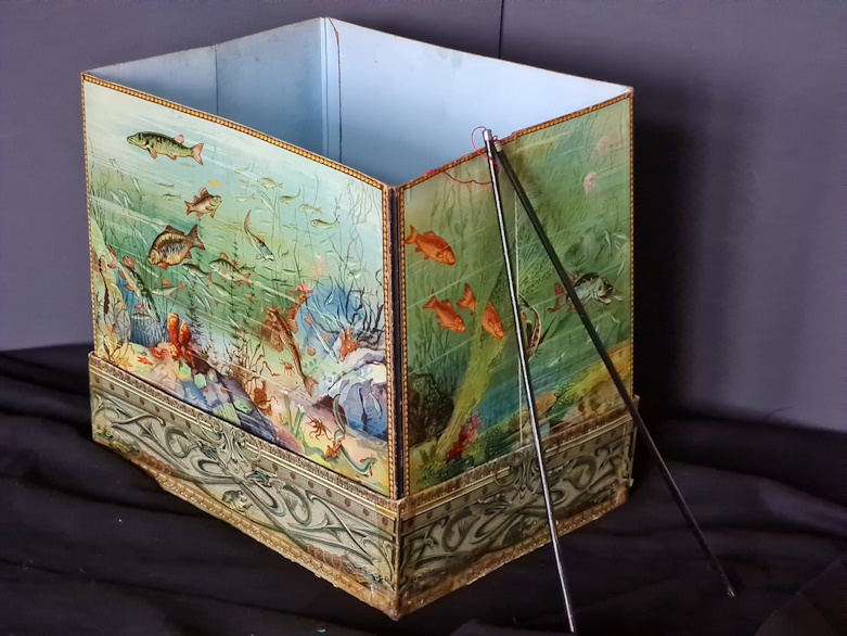 Die Datierung des Spiels ist nicht einfach. Während das schwarz-weiß Logo auf eine Entstehung vor 1908 hinweist, deutet das Rotsiegel mit der Inschrift Sala Spiele erfreuen jedes Kinderherz auf eine spätere Entstehungszeit hin. Die Spieleschachtel - einschließlich Deckel weist größere Schäden auf (Deckel gebrochen, Boden losgelöst). Das Aquariun ist sehr gut erhalten. Die Angelkarten sind vollständig, von den Fischen und Gegenständen, die aus dem Aquarium gefischt werden sind einige beschädigt.
