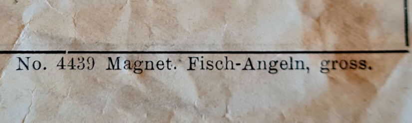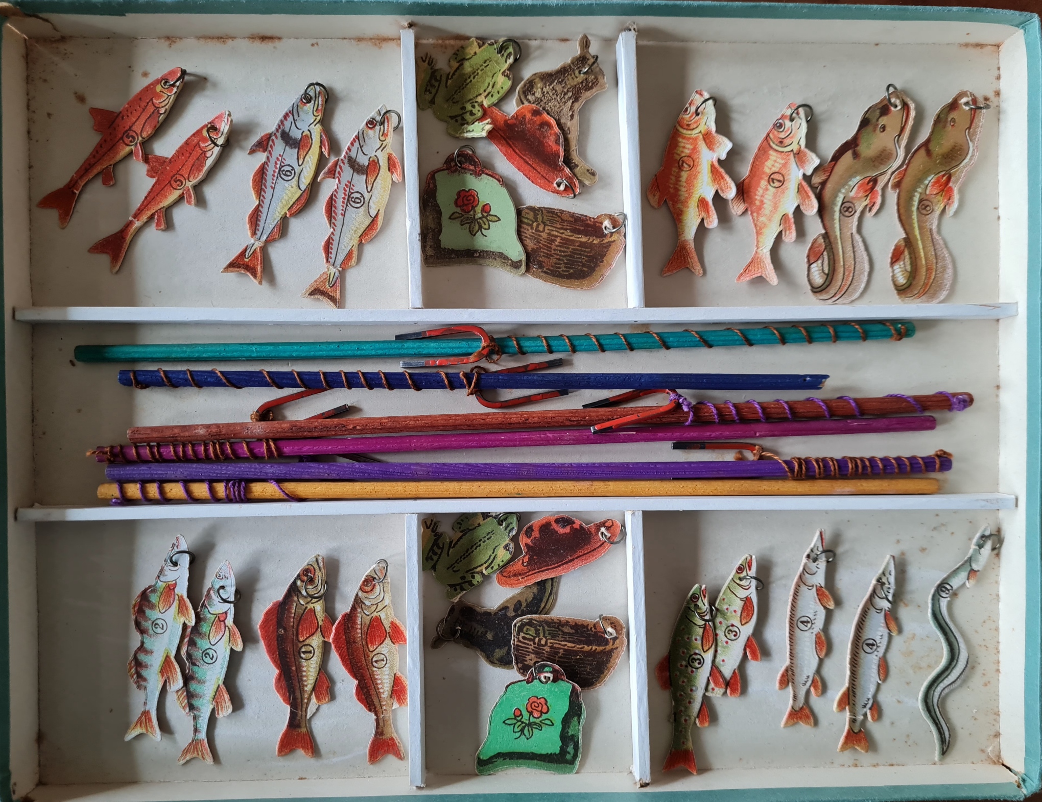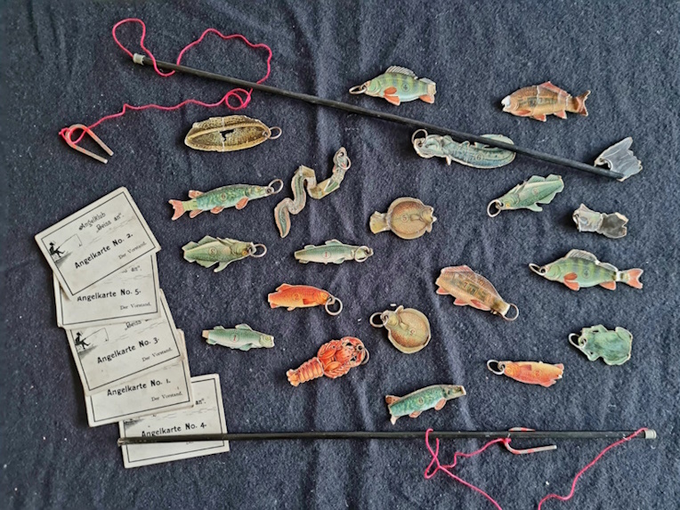 Das Sammlungsexemplar ist gut erhalten; es trägt die Produktionsnummer 601. In der Spieleschachtel befinden sich 6 Angeln 17 Fische 8 Gegenstände und zwei Frösche; die Spielanleitung befindet sich auf der Deckelinnenseite.