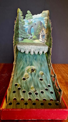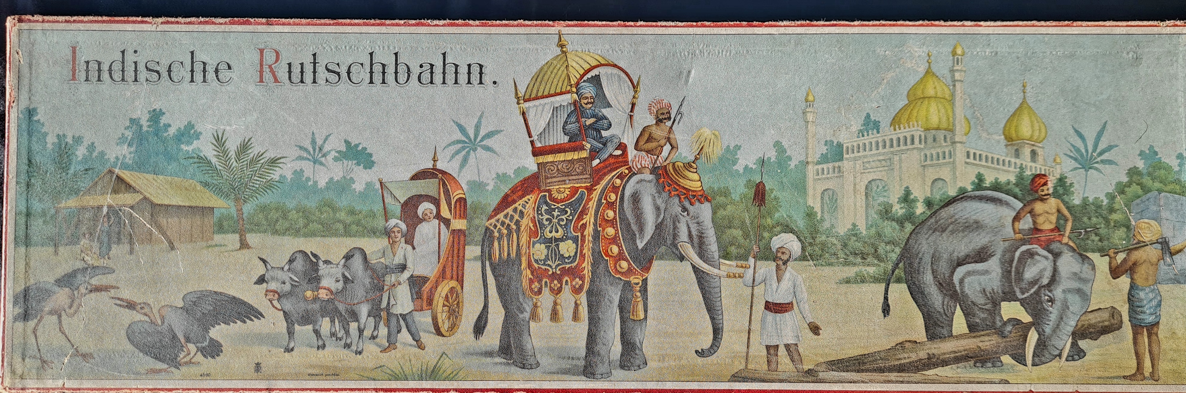 Indische Rutschbahn. Adolph Sala, Berlin. Frühe Sala Marke. Um 1910. Nr. 4580. Papier und Pappe, farbig lithografiert. Kasten: 9 x 72 x 22,5 cm. Seltenes Kugelspiel. Aufstellbare Spielkulisse in Form eines indischen Palastes und zweier Elefanten. Dazu 2 kleine originale Spielfiguren aus Celluloid und einige Glasmurmeln. Altersspuren, kleine Defekte, Vollständigkeit nicht geprüft.