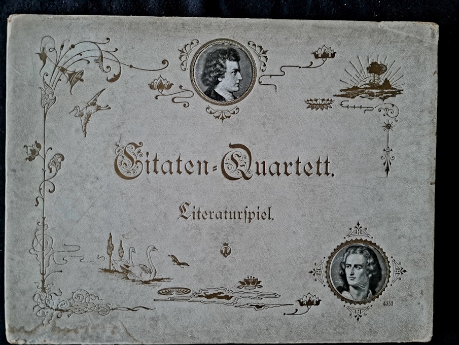 Literatur-Spiel. Citatenquartett für Jung und Alt. 180 chromolithographische Spielkarten in strukturgeprägter illustrierter OPappkassette (fleckig und berieben). (Berlin, Sala, um 1900). – Seltenes Quartettspiel mit 180 Spielkarten in der repräsentativen Aufstellkassette der für seine Luxuspapiere berühmten Berliner Papierwarenhandlung Sala. Jede Karte behandelt einen kanonischen Dichter, neben Goethe, Schiller, Wieland, Lessing, Heine, Chamisso, Rückert, Körner, Uhland und Shakespeare auch heute eher wenig gelesene Größen wie Ernst von Wildenburch und Emmanuel Seidel, jeweils mit einem Portrait, Lebensdaten und Zitat mit Herkunft, das es spielerisch bei Jung und Alt ins Gedächtnis einzuprägen gilt. Der Vorderdeckel mit der geprägten Produktionsnummer 4351. Lose beiliegend ein Blatt Spielanleitung. – Eine Karte mit kleiner Fehlstelle, sonst intakt und wohlerhalten und mit den 180 Karten wohl vollständig.