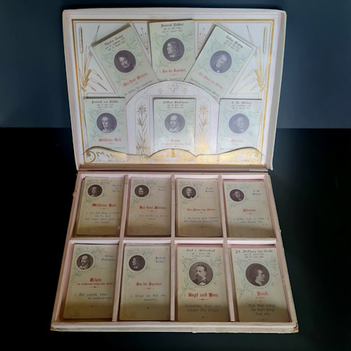 Das Sammlungsexemplar mit der Produktionsnummer 4350 enthält vollständige Quartette von 14 Dichtern und ist gut erhalten. Es stammt aus einem Oldenburger Antiquariat (Geschenk von Irene).