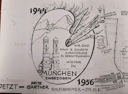 Im Archiv der Gemeinde Schönau ist auch eine Kopie der Umzugskarte aufbewahrt, die Gärtner bei seiner Rückkehr nach München im Jahr 1956 entwarf und er darin vom Ende einer 12-jährigen Evakuierung zu Berchtesgaden schrieb.