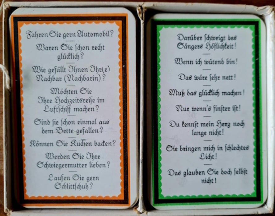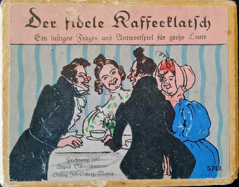 Die Karten des Sammlungsexemplars befinden sich in einer querformatiger Pappschachtel. Die jeweils 24 Frage und Antwortkarten sind vooollstänig vorhanden; die Deckelinnenseite enthält die Spielanleitung. Auf dem Deckel ist neben der Zeichnung von Arpad Schmidhammer der Spieltitel und die Seriennummer 5749.