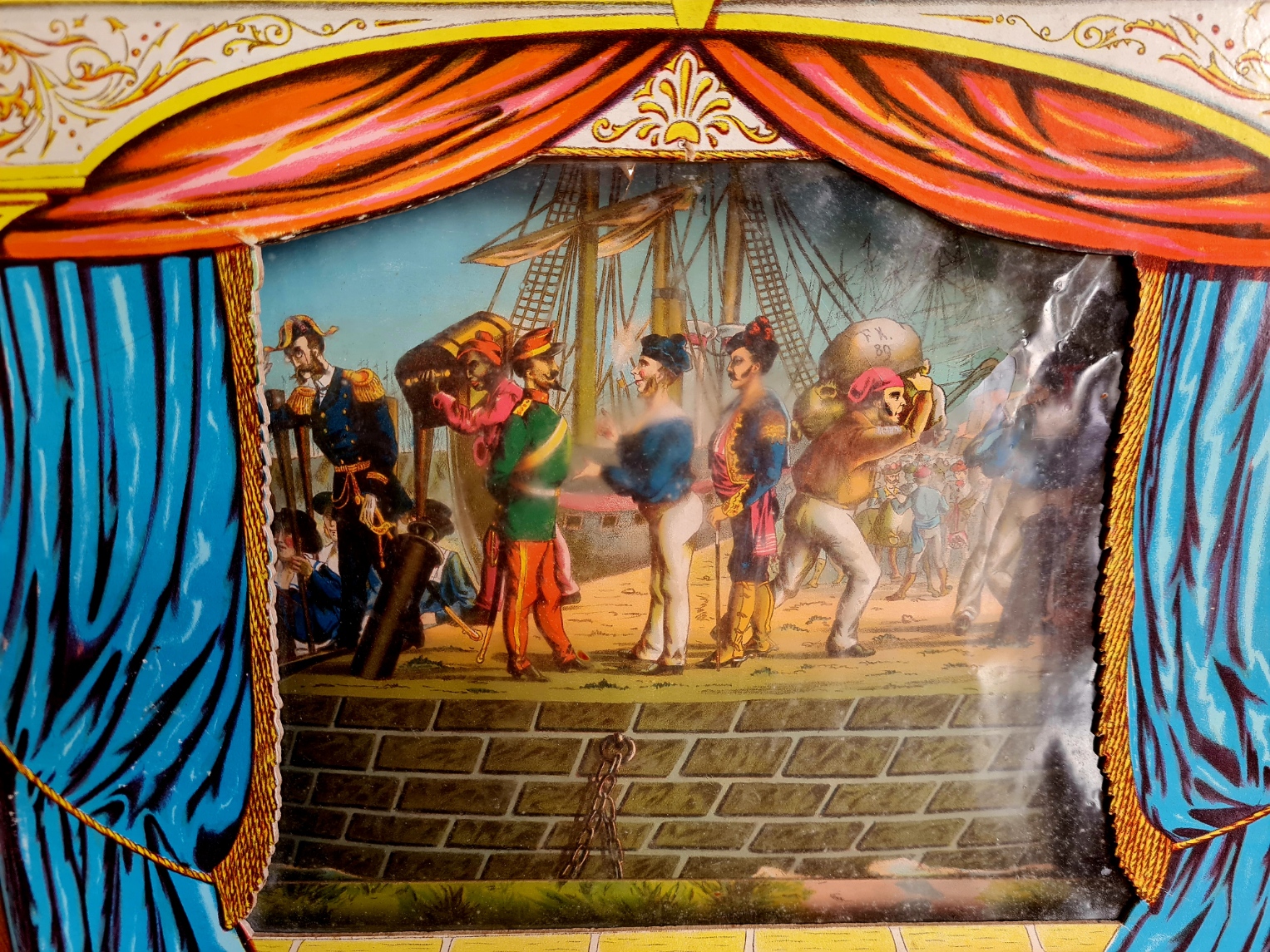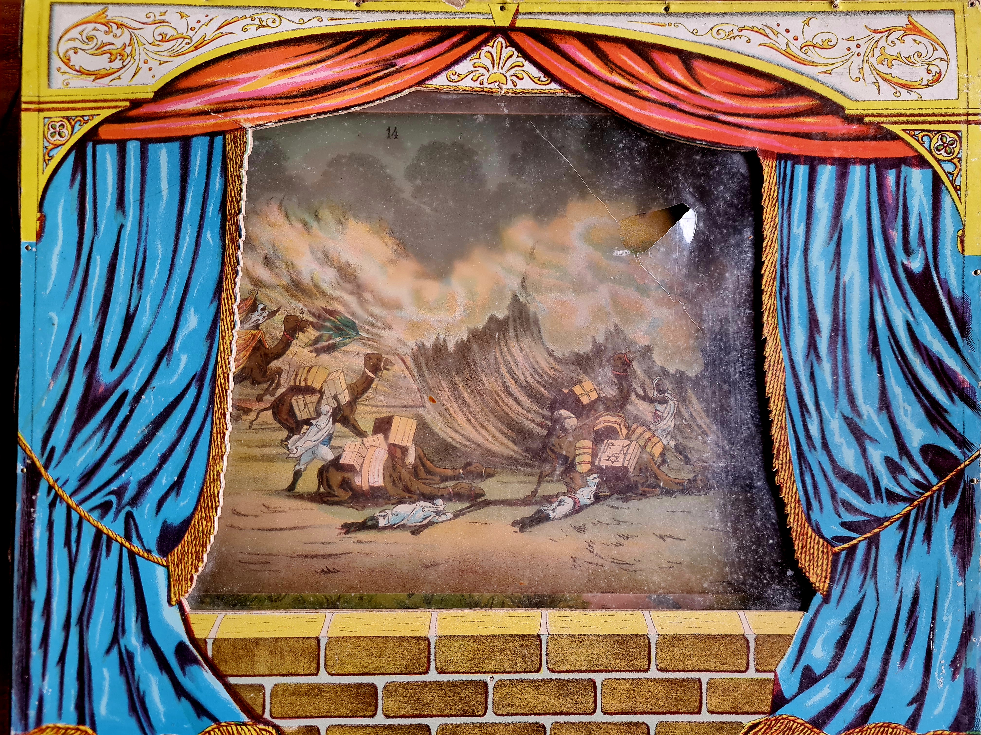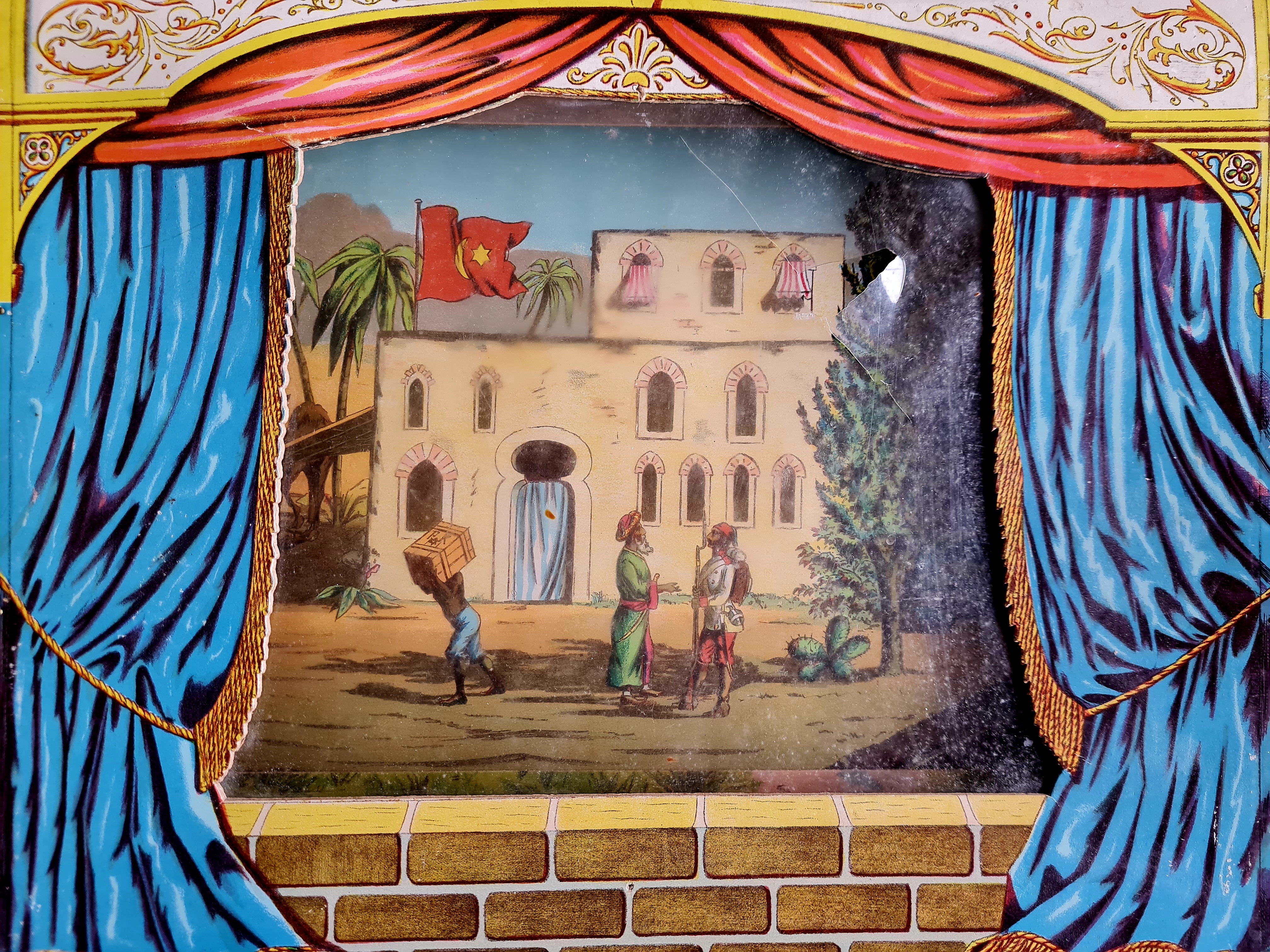 Das abgebildete Papiertheater wurde auf einem Antikmark in München erworben (um 2000). Das Kulissengehäuse besteht aus Pappmaché, die Kulissenwand mit 22 Motiven ist rollbar. Anstelle einer Holzkurbel ist ein Drehknopf vorhanden. Geschildert wird eine Reise mit dem Segelschiff von einem spanischen Hafen nach Port Said, danach weiter nach Kairo, auf Kamelen durch die Wüste und schließlich über den Nil zu den Muselmännern. Die Frontabdeckung des Theaters (Gelatine ?) hat einen Riss, die rückseitige Abdeckung ist weitgehend zerstört (vermutlich durch die verwendete Lichtquelle: Kerze). Die Bilderrolle hat kleine Einrisse. Die separat aufstellbaren Seitenteile sowie die Pappkassette fehlen.