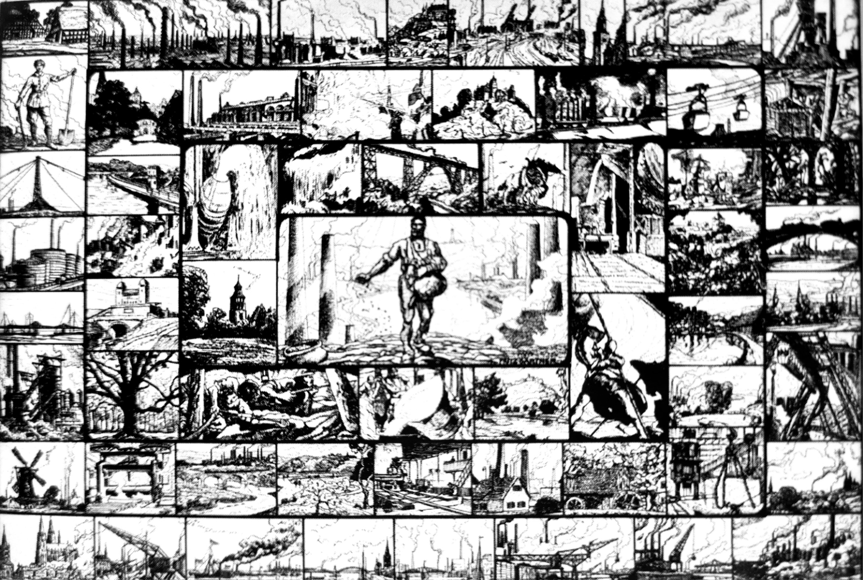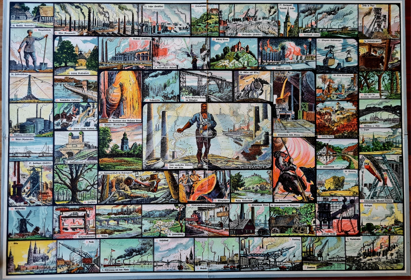 […] Hinweise finden sich jedoch auf das Spiel „Unter rauchenden Schloten“ „ein Reise-Würfelspiel durch das Rheinisch-westfälische Industrie-Gebiet von Köln bis Münster mit Bildern des Künstlers“, das unter der Nr. 5305 im Verl Jos. Scholz, Mainz etwa zeitgleich mit dem Quartettspiel erschienen ist. Es reiht sich in die zahlreichen Reisespiele ein, die die Welt ins Kinderzimmer bringen und die Geografiekenntnisse der spielenden Kinder erweitern sollen. „Das Spiel enthält in dem mit einem bunten Deckelbild geschmückten 39,5:34,5 cm großen Kasten einen bunten Spielplan in Größe von 73:50,5 cm mit 60 Bildern von des Künstlers Hand.“ - so der Werbetext.