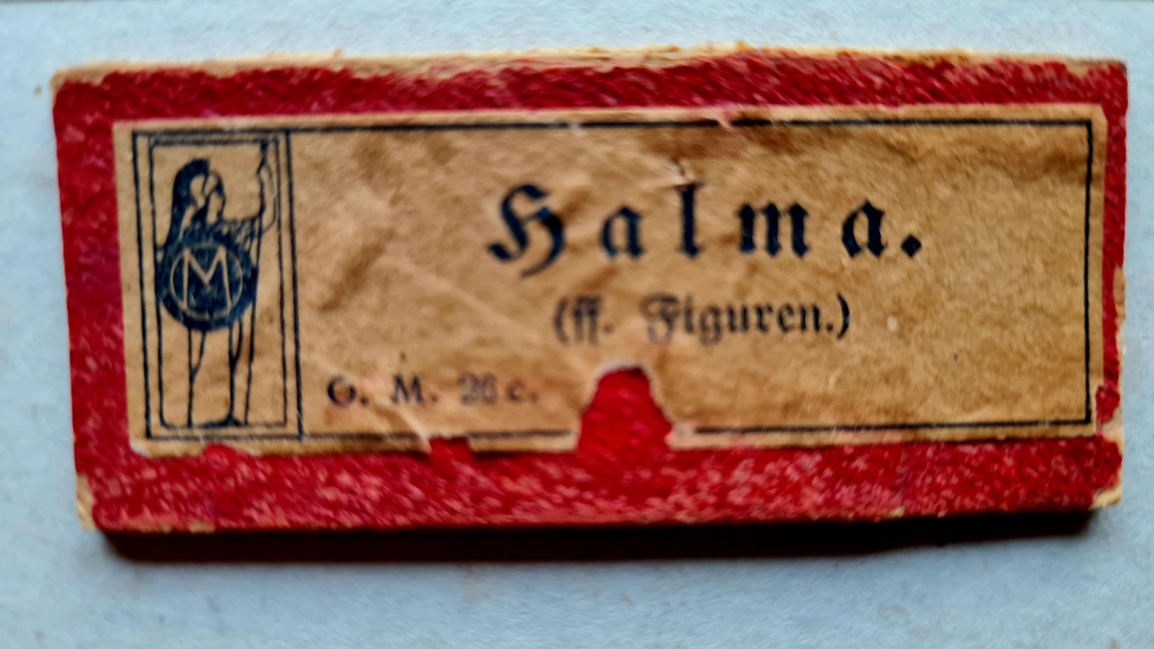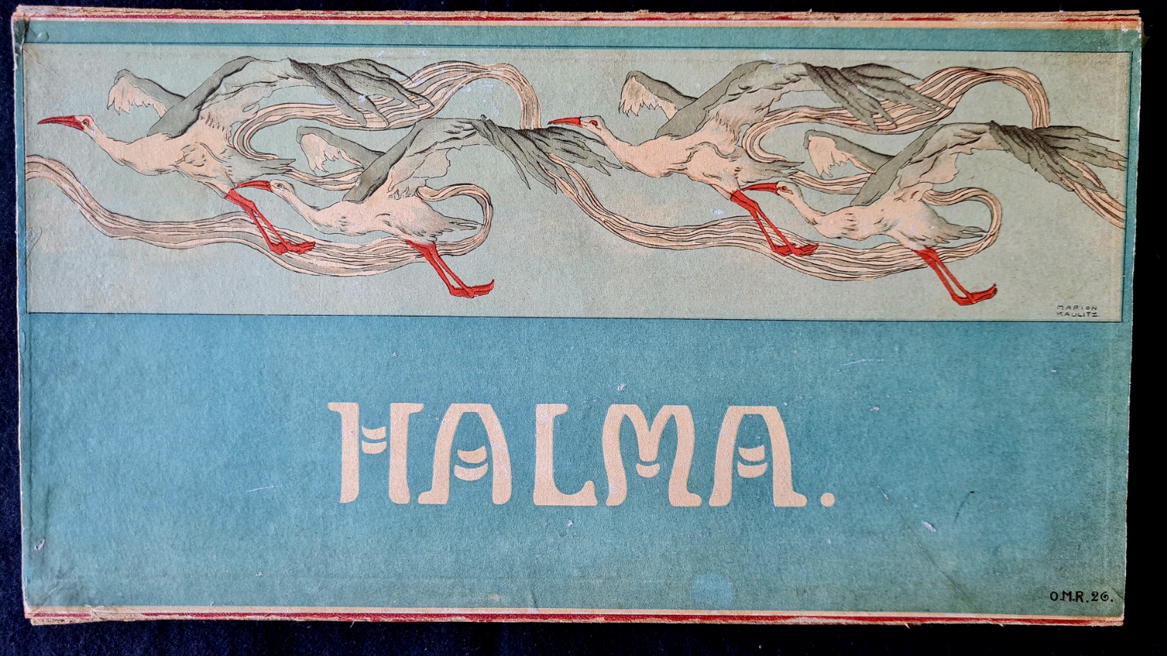 Im Internet werden einige Versionen des Halmaspiels angeboten, die mit den Zeichen O.M.R.26 versehen sind. Es gibt keinerlei Hinweise auf eine Version, deren Spieleschachtel mit einer Grafik der Künstlerin Marion Kaulitz versehen ist. Das Exemplar in der Spielesammlung trägt außerdem ein Logo des Ravensburger Verlages, das auf eine Entstehung um 1913 hinweist. Spielfiguren sind ausreichend vorhanden.