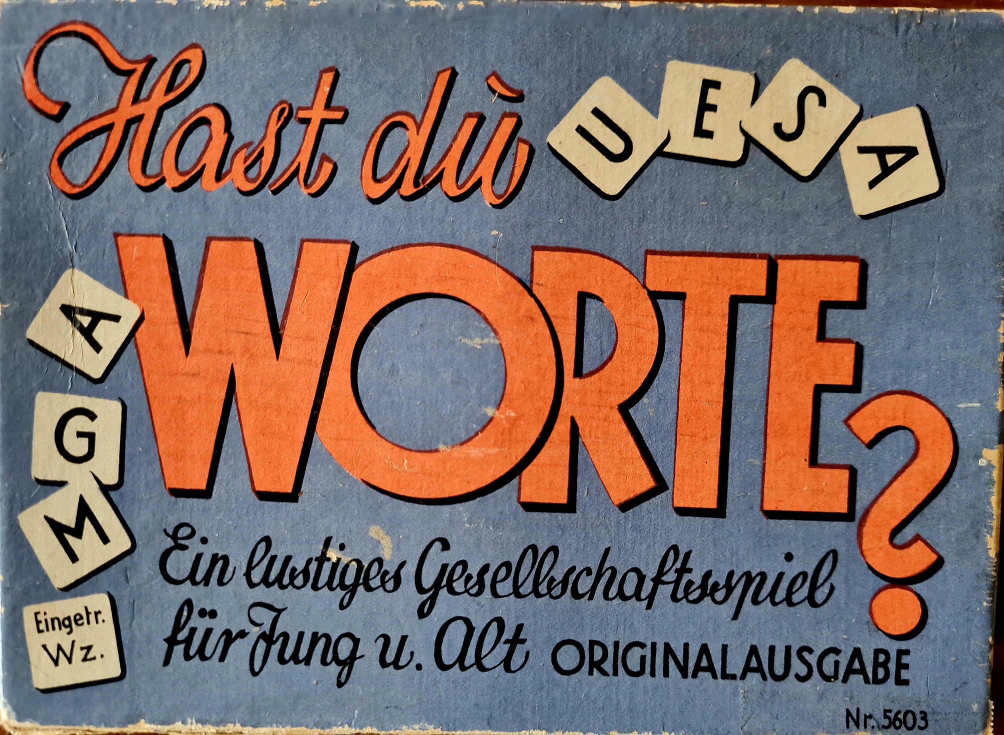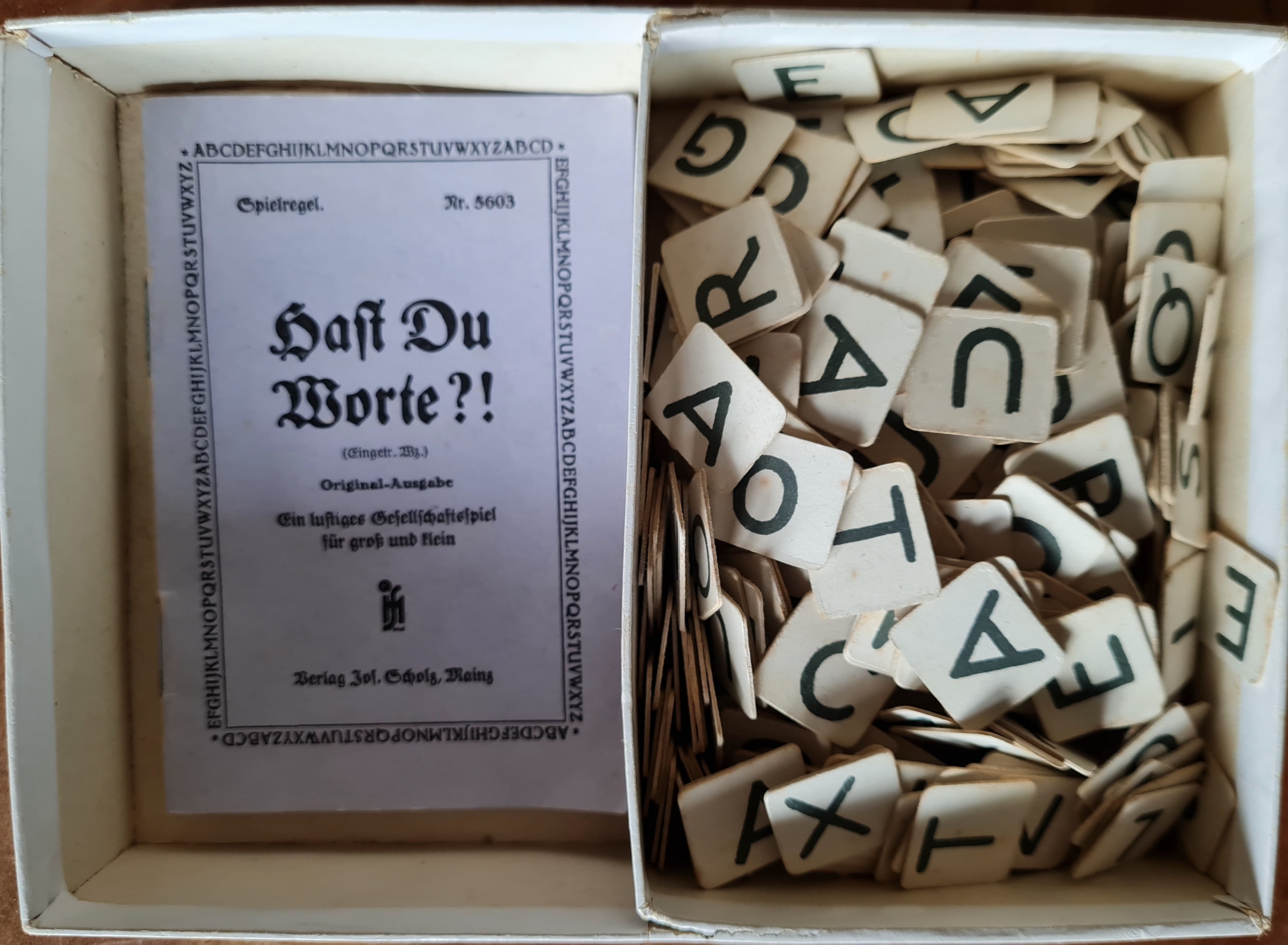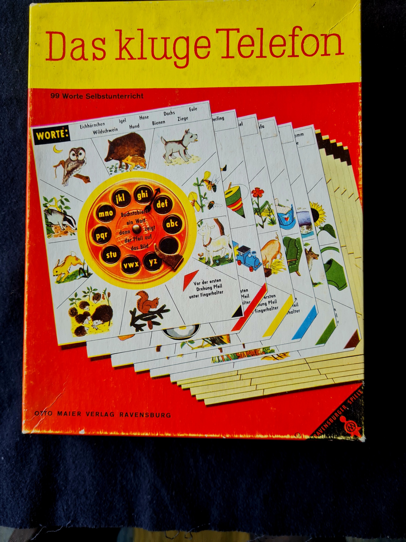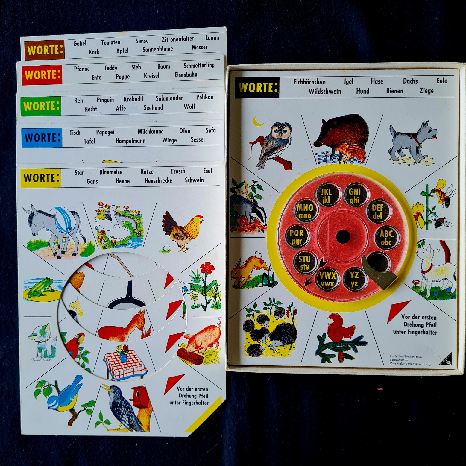Das Spiel wurde 1962 veröffentlicht. Eine genaue Bechreibung des Buchstabierspiels findet sich Im Internet: https://www.eichwaelder.de/Altes/altesspiel182.htm Das Exemplar in der Spielesammlung enthält alle 5 beidseitig bedruckten Lesetafeln.