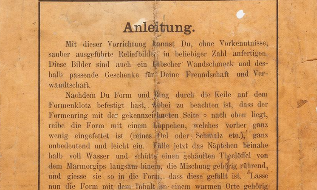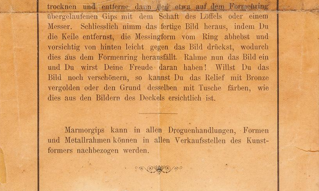 Modellierspiel Datierung 1890er Jahre Material/Technik Eisen, Weissblech, Holz, Porzellan, Gips, Gipsmehl, Papier Maße7 x 22,5 x 27,5 cm InventarnummerSZ-BES-F-4 Bereich Historisches Spielzeug – Beschäftigungsspiele Beschreibung Beschäftigungsspiel “Der kleine Kunst - Former” zur Anferigung kleiner Gipsmedaillons, Fa. Luxus-Papier-Fabrik Berlin, Nr. 4174, Made in Germany Aus der Firma Fa. Luxus-Papier-Fabrik Berlin, gegründet 1845 von Adolf Sala, entstand die Firma Sala Spiele bzw. Sala Rotsiegel. Maxime der Firma war “Hoher Preis - hohe Qualität”