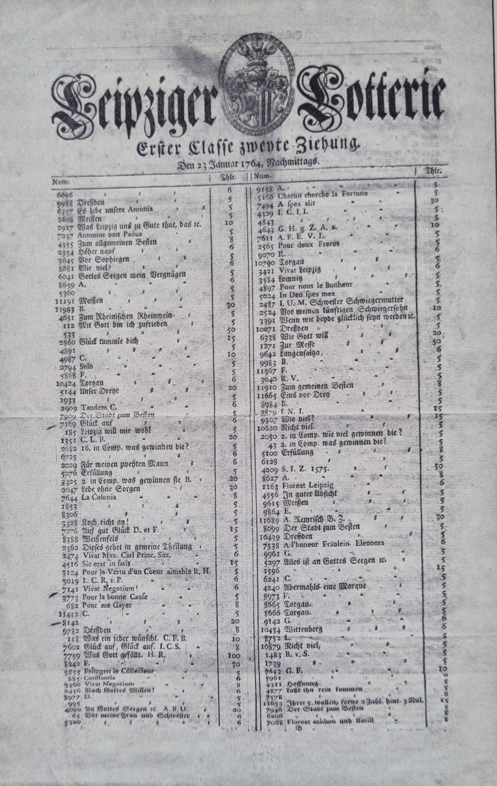 Ein weiterer Hinweis auf das Entstehungsjahr ergibt sich aus der Beschriftung der beiliegenden Lotterielose mit den Nummern 1250 bis 1299 (vollständig vorhanden), die an die Mitspieler gegen einen Einsatz verkauft werden:
