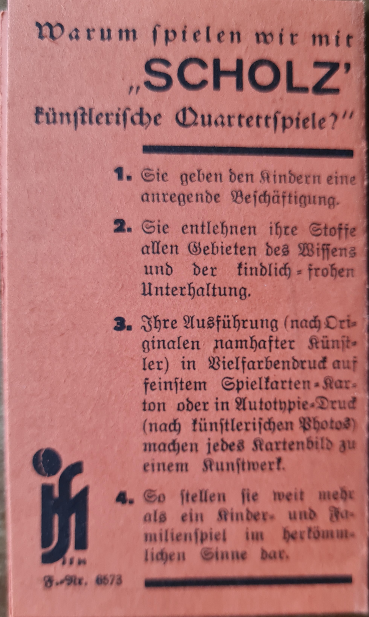 Die 48 Karten des Quartettspiels sind gut erhalten. Eine Seite der beiliegenden Spielregel gibt Antwort auf die Frage Warum spielen wir Scholz’ künstlerische Quartettspiele?“ und verdeutlicht den besonderen künstlerischen und pädagogischen Anspruch, der mit der Herstellung dieser Spiele verbunden war.
