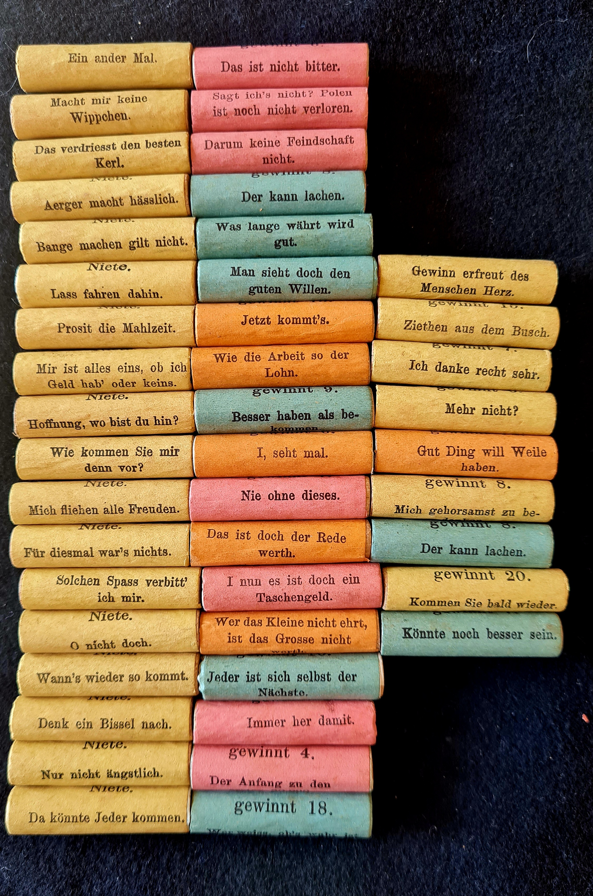 Vorbild für dieses Spiel waren Lotterien, die seit dem 17. Jahrhundert an mehreren Orten in Europa durchgeführt wurden - meist um eine leere Staatkasse zu füllen oder um bestimmte Institutionen zu begünstigen. In 18. Jahrhundert waren es vorrangig zwei Versionen von Glücksspielen - das Lotto, z.B. die als Genuesisches Lotto (5 Gewinnzahlen aus 90) bekannte Version1 - und die Lotterie oder Klassenlotterie. Lotterie - häufig auch Nieten und Gewinne Lotterie bezeichnet - basiert auf der Verwendung von zwei Zufallsziehungen unter Verwendung von Lostrommeln oder ähnlchen Instrumenten (allgemein als Urnen bezeichnet). Eine Urne wird mit einer endlichen Zahl von nummerierten Losen gefüllt, während eine zweite eine gleiche Anzahl von mit als Niete oder Gewinn (in unterschiedlicher Höhe) markierten Losrollen enthält. Durch gleichzeitige Ziehung aus den beiden Urnen entsteht eine Zuordnung von Los zu Niete/Gewinn für alle nummerierten Lose. Auf diese Weise konnten Gewinnlisten erstellt werden, die die Losnummer und den auf dieses Los entfallenen Gewinnbetrag enthielten - häufig ergänzt durch einen Spruch.