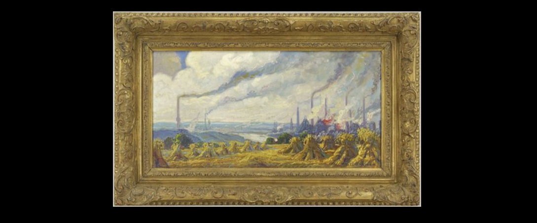 Im Deutschen Bergbau Museum Bochum befindet sich ein weiteres Gemälde von Fritz Gärtner aus dieser Zeit (1900-1920), das Ölgemälde “Brot und Eisen”, Kornernte vor Industrielandschaft.