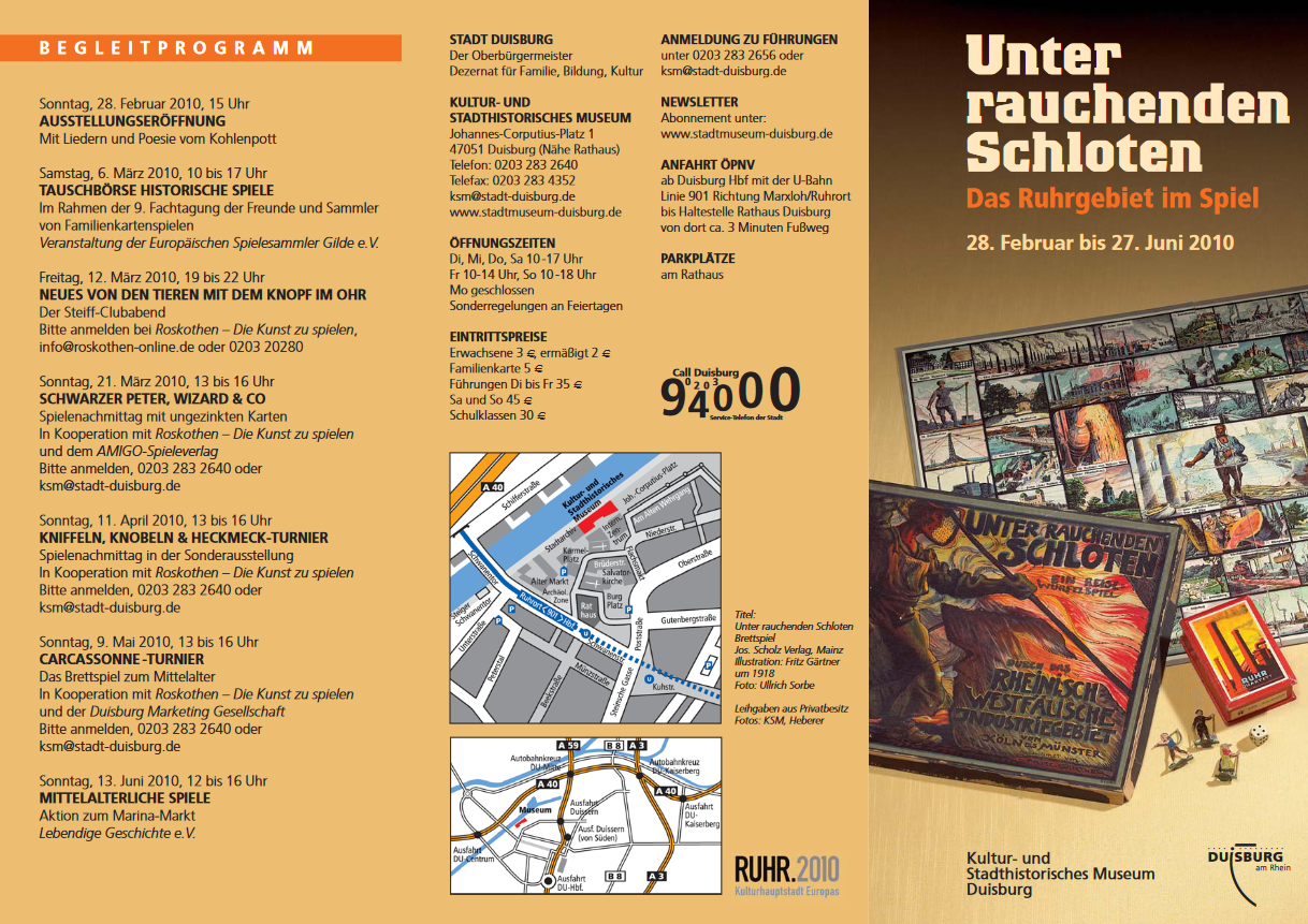 Hinweise auf das Spiel UNTER RAUCHENDEN SCHLOTEN finden sich auf einem Flyer zu einer Ausstellung im Kultur- und Stadthistorischen Museum in Duisburg.