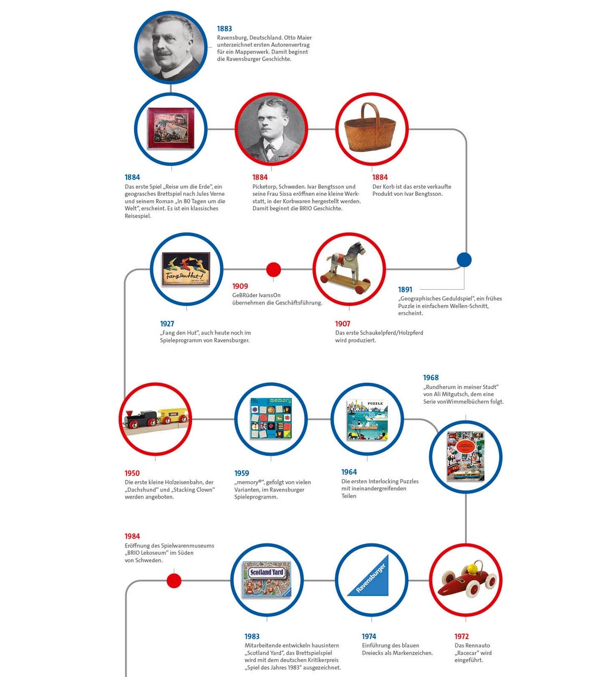 Die nachfolgende Grafik zeigt die wesentlichen Meilensteine der Geschichte des Verlages bis ins Jahr 1974, dem Jahr der Einführung des Blauen Dreiecks als Markenzeichen und des Starts der Produktion einer großen Zahl von Spielen (einige davon wurden als Spiel des Jahres ausgezeichnet). https://www.ravensburger-gruppe.de/de/ueber-ravensburger/unsere-geschichte/index.html