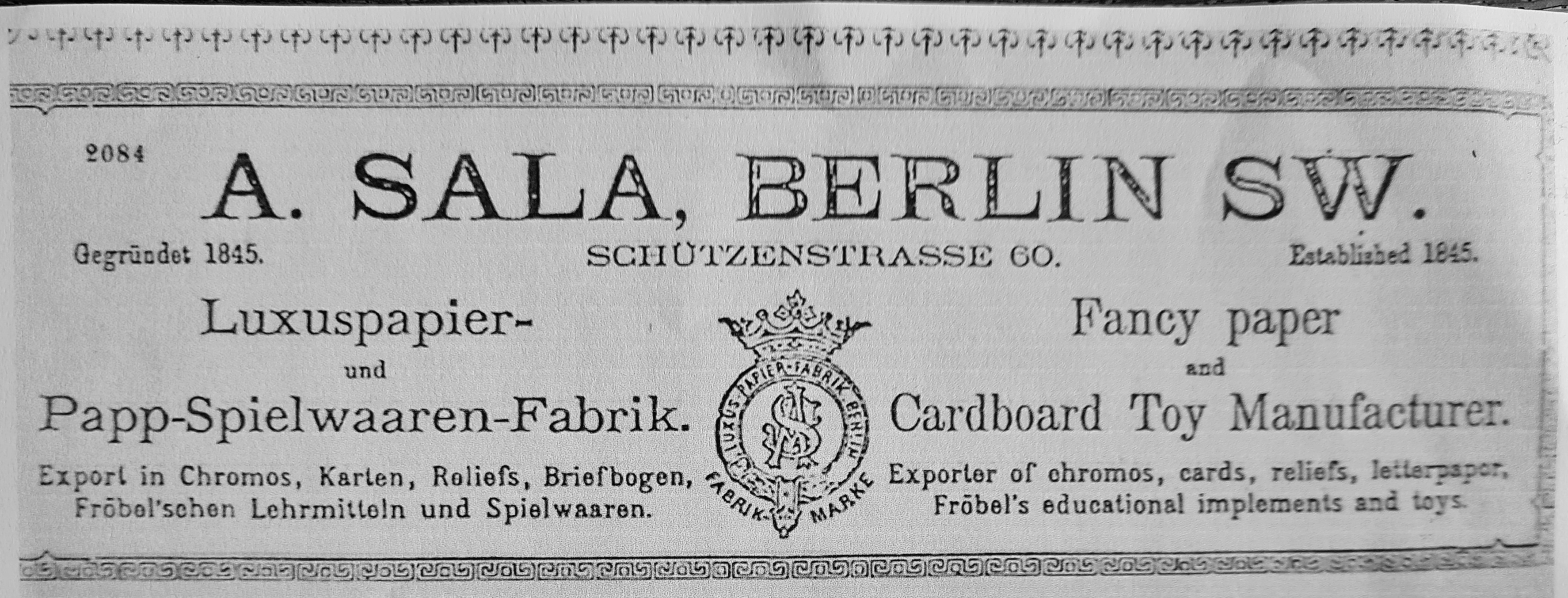 Spätestens ab 1882 kamen seine Söhne Adolf und Fortunato Sala ins Spiel. Zu diesem Zeitpunkt wurde auch zum erstmals der Begriff Spiel in den Firmennamen aufgenommen: Fabrik Fröbelscher Lehrmittel und Spiele.