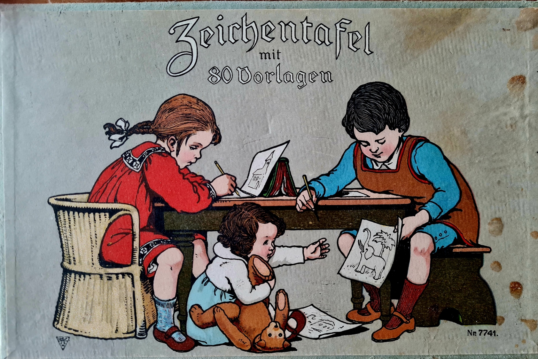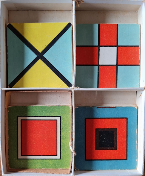 Quartett. Verlags-Nr. 6001 - Erschienen (um 1930). - 17:17 cm. Grün bezogener Karton mit montierter farbiger Deckelillustration. Inhalt: Quadratischer Kasten mit Unterteilung in vier Segmente, die insgesamt 12 x 4 Kartensets enthalten. Dargestellt sind Tierkinder, Mond und Sterne sowie Alltagsgegenstände. Kastendeckel an einem der ausgestanzten Grifflöcher am Rand leicht eingerissen, sonst recht gut. Einzelne Karten haben leichte Knickspuren. Hübsches Expl.
