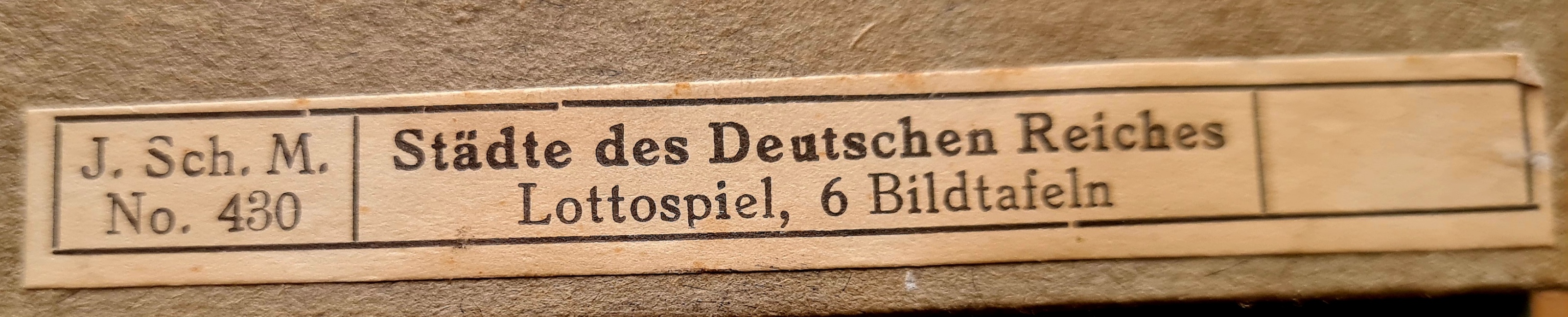 Titel: Städte des deutschen Reiches - Ein Geographisches Lottospiel mit Bildern von Emil Heinsdorff Typ: Sonstige Gesellschaftsspiele Verlag: Verlag Jos. Scholz Jahr: 1910 Beschreibung: Ein geographisches Lottospiel mit Bildern im rechteckigen Karton. Auf dem Deckel aufgezogen ein farbiger Druck mit einer Ansicht der Stadt Nürnberg mit Burg und einem Text: “Städte des deutschen Reiches. Ein geographisches Lottospiel mit Bildern von Emil Heinsdorff. Große Ausgabe.”Verlag von Jos. Scholz, Mainz”, “Nr. 5082” / “Scholz´ künstlerische Spiele/ Spiel mit”. Im Deckel innen aufgeklebt die Spielanleitung, der Inhalt bestehend aus: Sechs Tafeln aus Karton, aufkaschiert jeweils ein Farbdruck, in dessen Mitte eine Karte des Deutschen Reiches, seitlich jeweils eine Ansicht einer Stadt, oben und unten jeweils vier Ansichten (Sehenswürdigkeiten, Wahrzeichen). In der Mitte der Ansichten ein achteckiger auslösbarer Bildausschnitt, auf dessen Rückseite eine Frage sowie eine Nummer aufgedruckt sind. Leider sind in dem Spiel nur 5 Tafeln dabei , diese etwas unterschiedlich erhalten Spiel Schachtel deutlich beschädigt, Spiel ist kaum zu finden (habe nur eines im Museum gefunden) sicherlich noch ein gutes Sammlerstück.