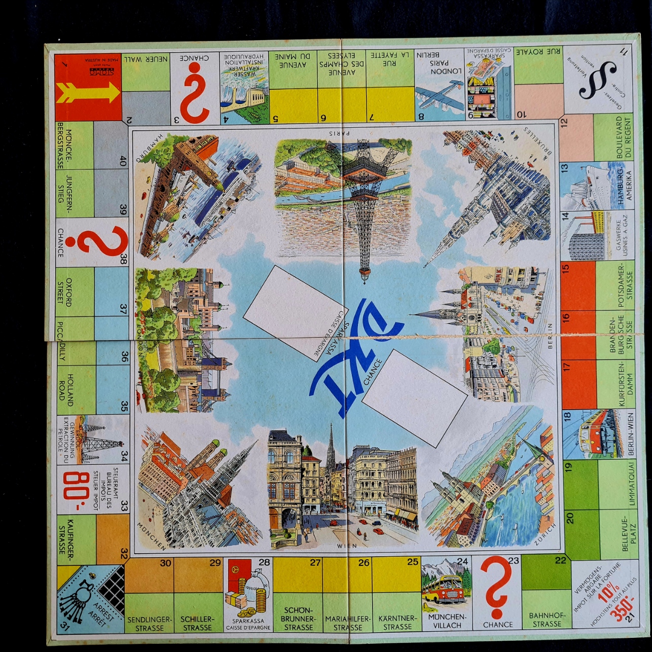 Beim Exemplar der Spielesammlung handelt es sich um eine ältere Europa-Ausgabe mit den Städten Wien, Zürich, Berlin, Bruxelles Paris, Hamurg, London, München und z.B. eine Busverbindung München-Villach. Die Häuser, Hotels und karten sind Karten sind vollständig - lediglich eine (von sechs) Spielfigur fehlt.