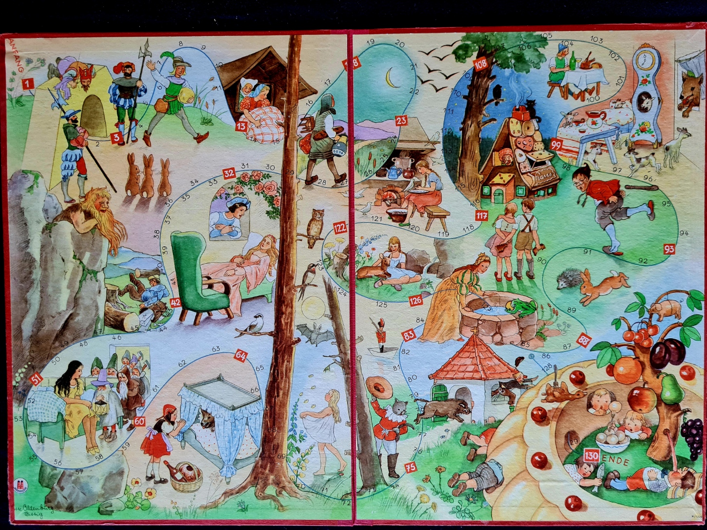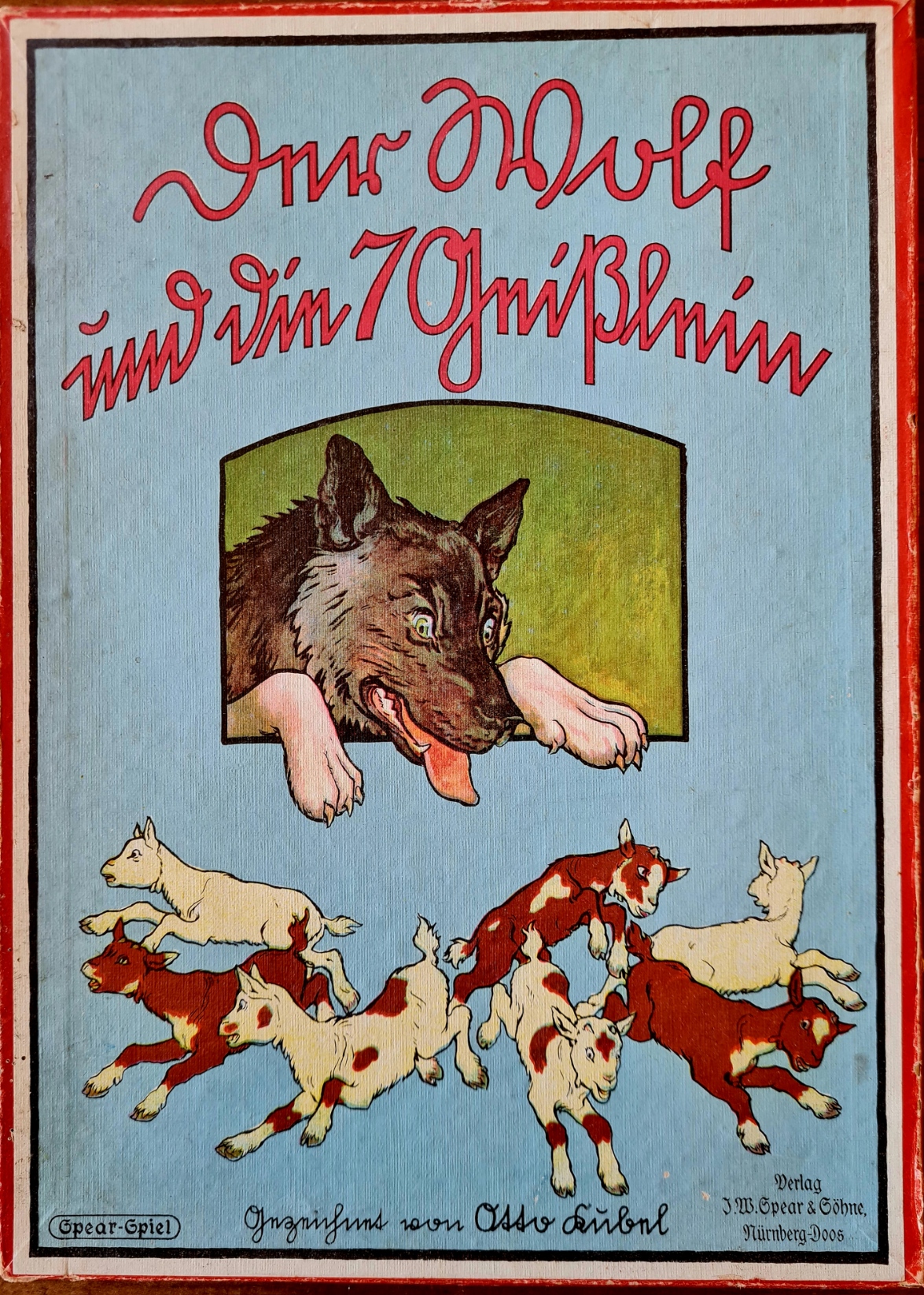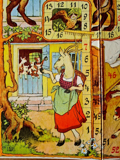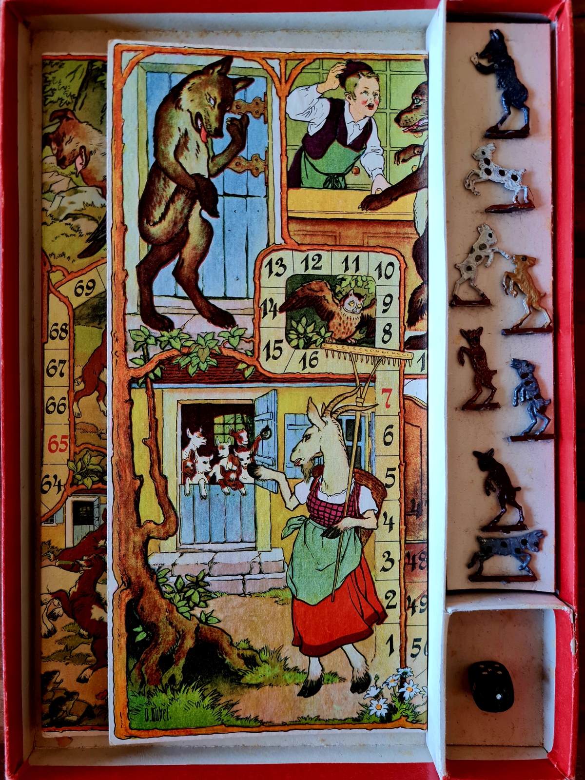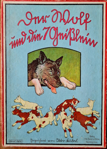 Originalkasten mit buntem Deckelbild; 30,5 x 22 x 2,5 cm. Inhalt: gefalteter, farbig illustrierter Spielplan auf dicker Pappe (quer 29 x 43 cm); Spielfiguren aus Zinn in alter Originalbemalung: 1 Wolf, 6 (statt 7) Geißlein; 3 Würfel. - Spielanleitung im Deckel. Sprache: de (Spielplan im sehr guten Zustand; 1 Geißlein fehlt; Deckelrahmen unauffällig mit zum Kasten passenden , roten Papierstreifen bezogen; Deckel gering fleckig)