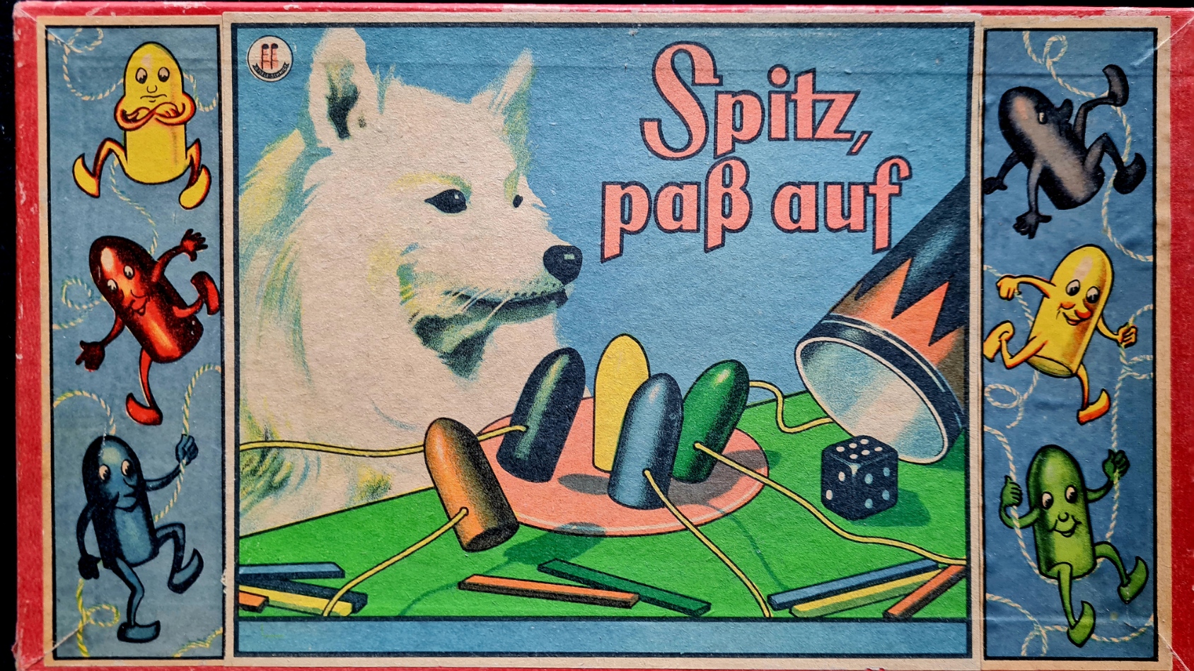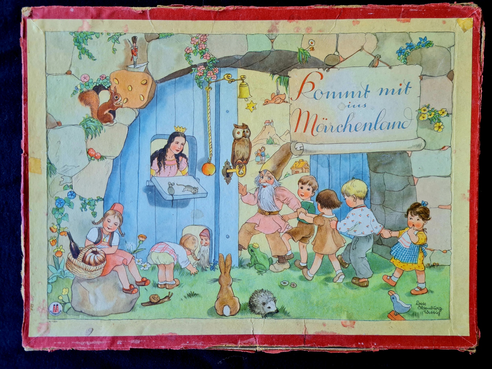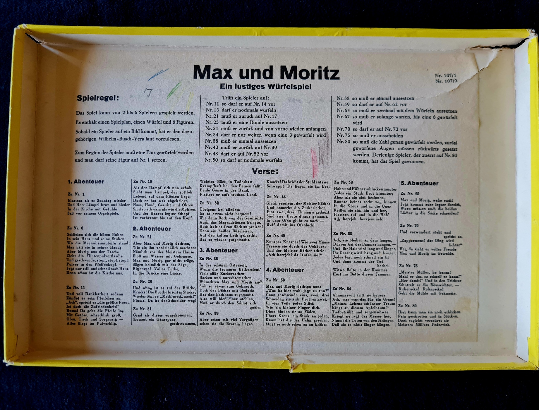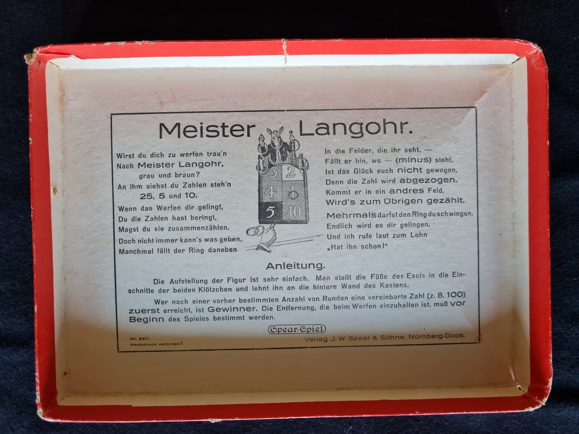 Originalkasten mit buntem Deckelbild; 30,5 x 22 x 2,5 cm. Inhalt: gefalteter, farbig illustrierter Spielplan auf dicker Pappe (quer 29 x 43 cm); Spielfiguren aus Zinn in alter Originalbemalung: 1 Wolf, 6 (statt 7) Geißlein; 3 Würfel. - Spielanleitung im Deckel. Sprache: de (Spielplan im sehr guten Zustand; 1 Geißlein fehlt; Deckelrahmen unauffällig mit zum Kasten passenden , roten Papierstreifen bezogen; Deckel gering fleckig)
