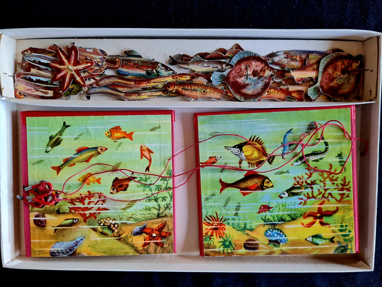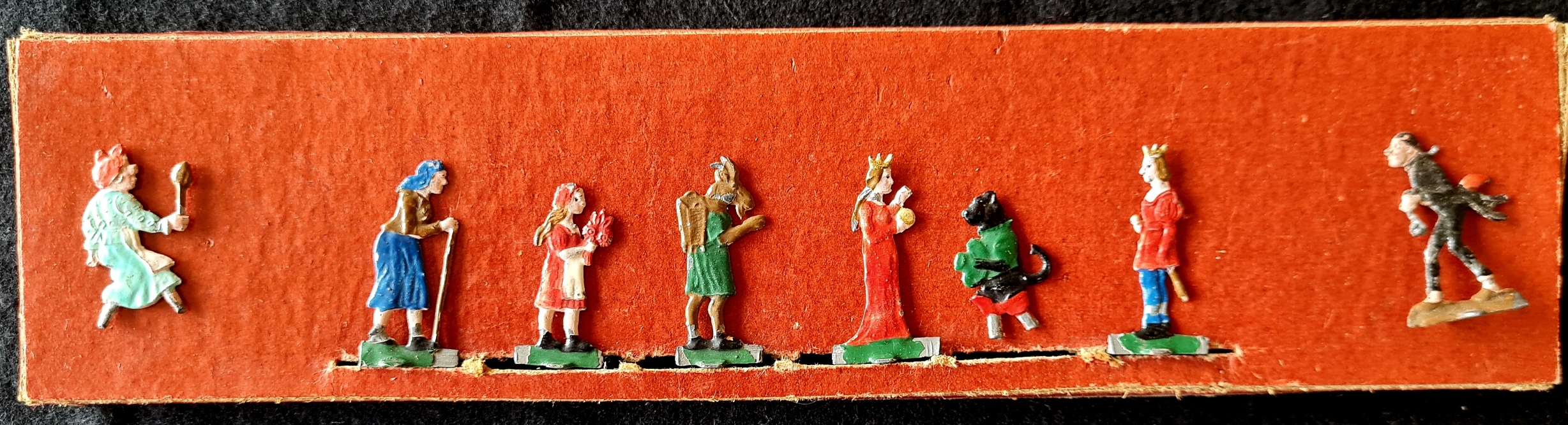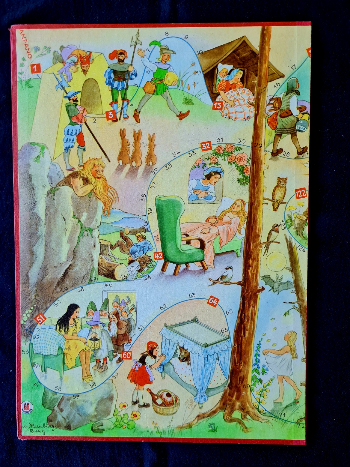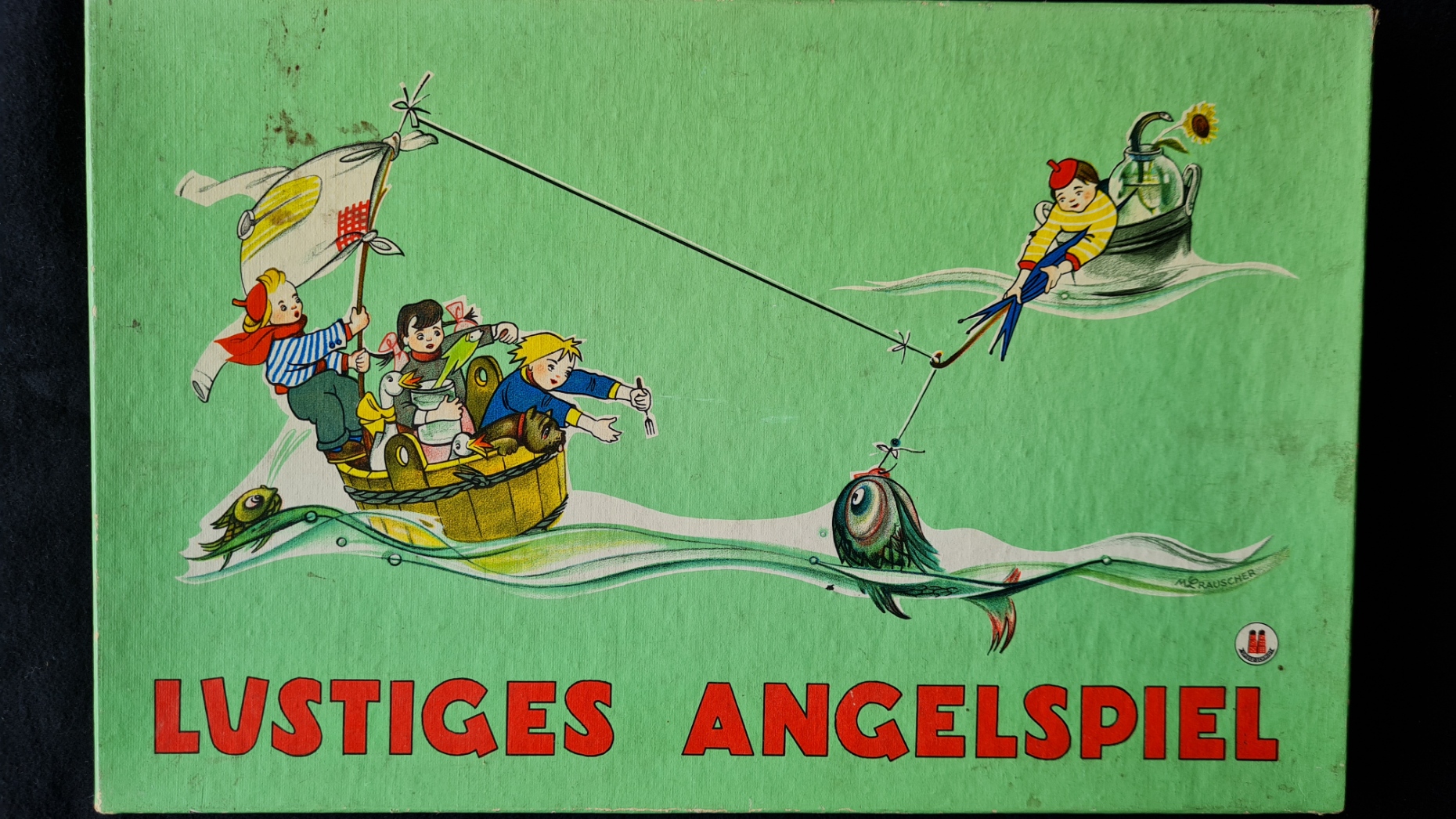 Originalkasten mit buntem Deckelbild; 30,5 x 22 x 2,5 cm. Inhalt: gefalteter, farbig illustrierter Spielplan auf dicker Pappe (quer 29 x 43 cm); Spielfiguren aus Zinn in alter Originalbemalung: 1 Wolf, 6 (statt 7) Geißlein; 3 Würfel. - Spielanleitung im Deckel. Sprache: de (Spielplan im sehr guten Zustand; 1 Geißlein fehlt; Deckelrahmen unauffällig mit zum Kasten passenden , roten Papierstreifen bezogen; Deckel gering fleckig)