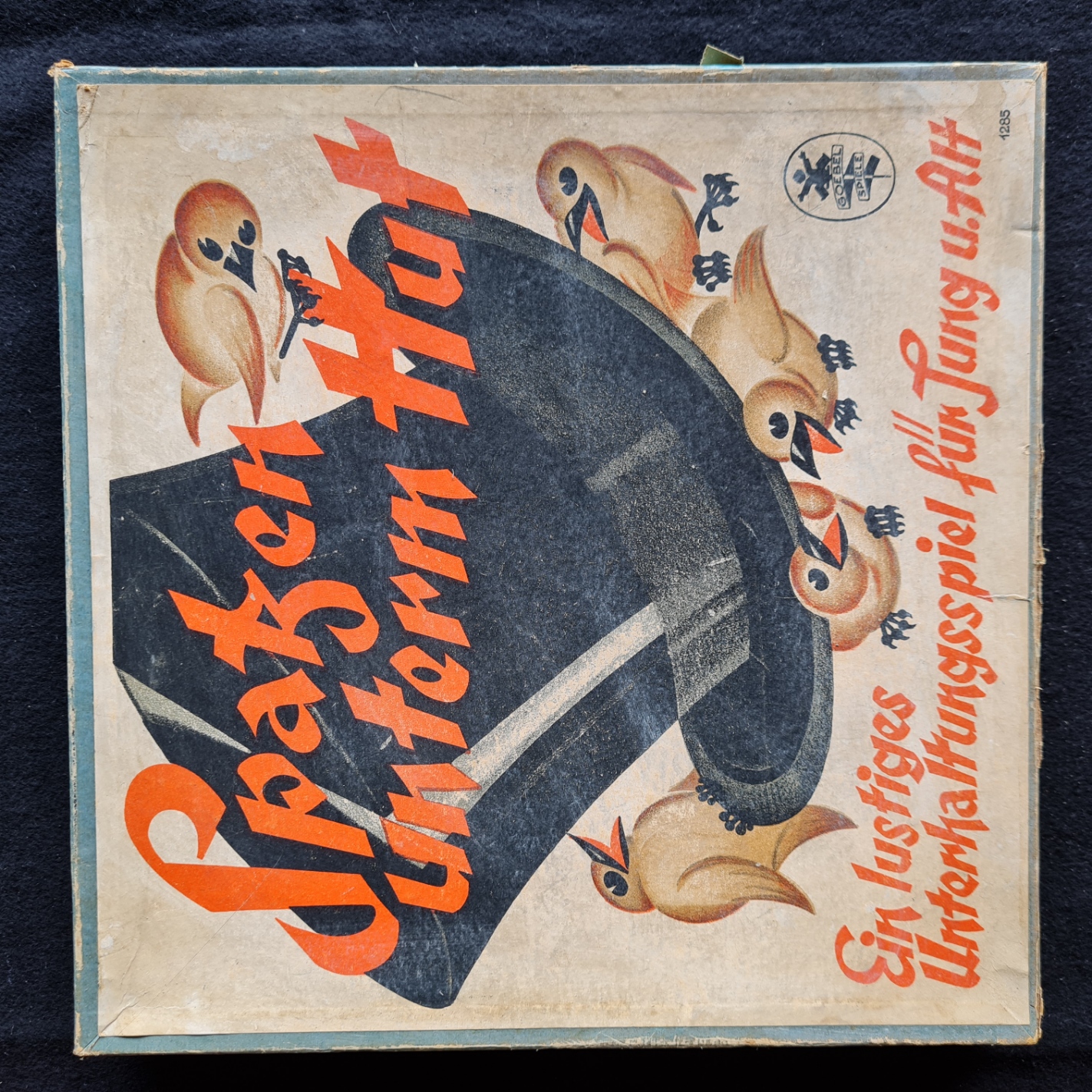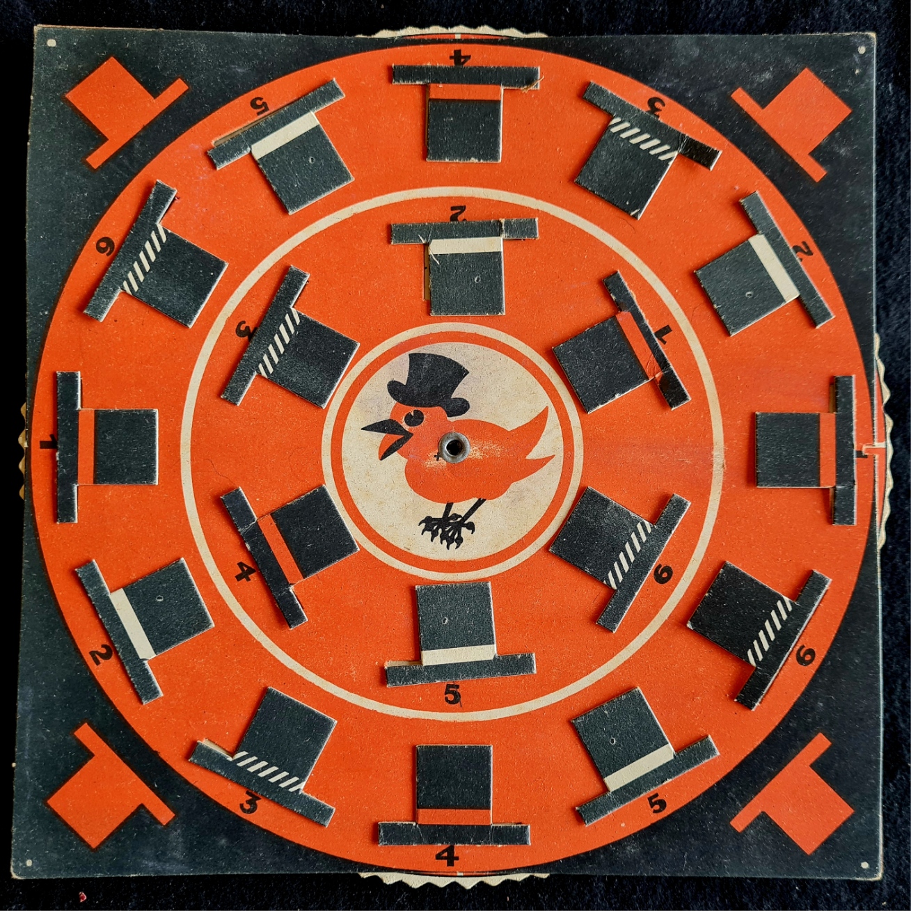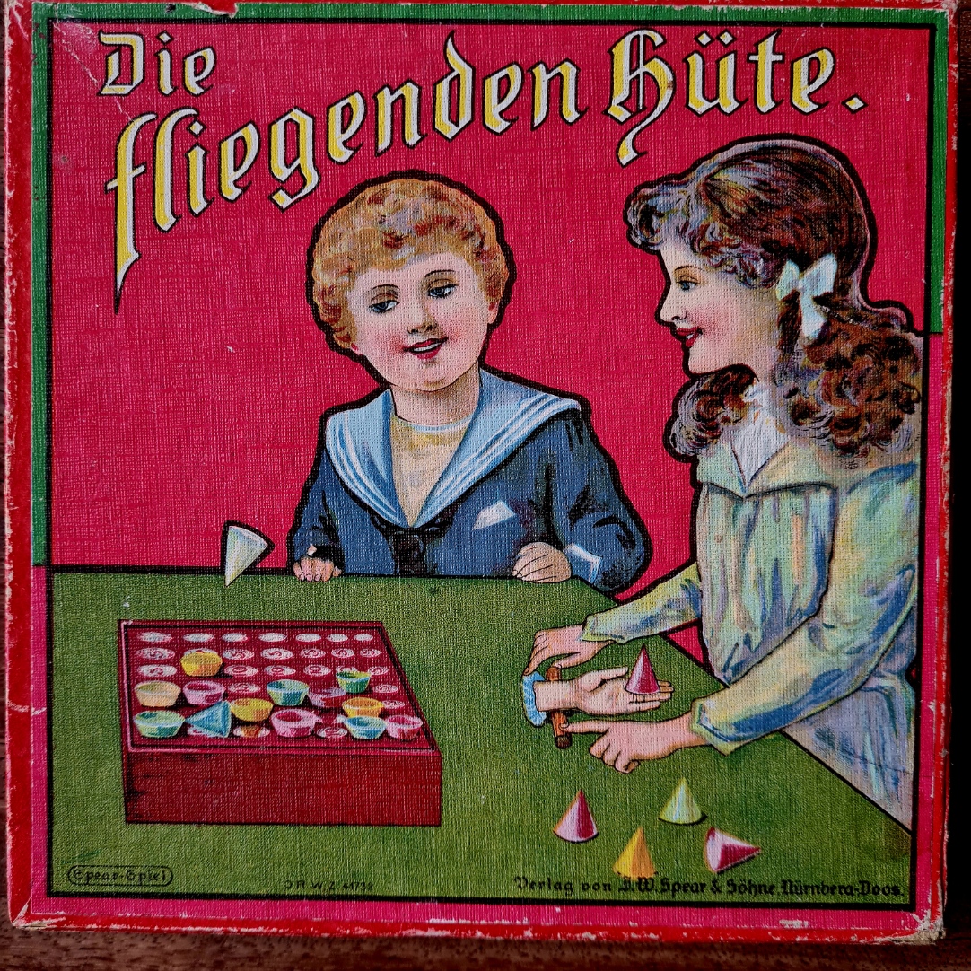 Ein auf dem memory-Prinzip basierendes Unterhaltungsspiel. Die Drehscheibe und die 24 Hüte (vollständig) sind gut erhalten. (Beliebige Spielmarken sollten bereit liegen).
