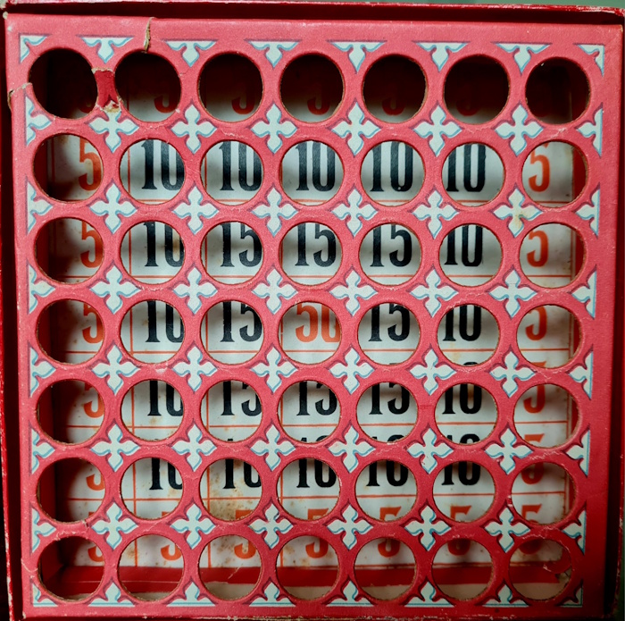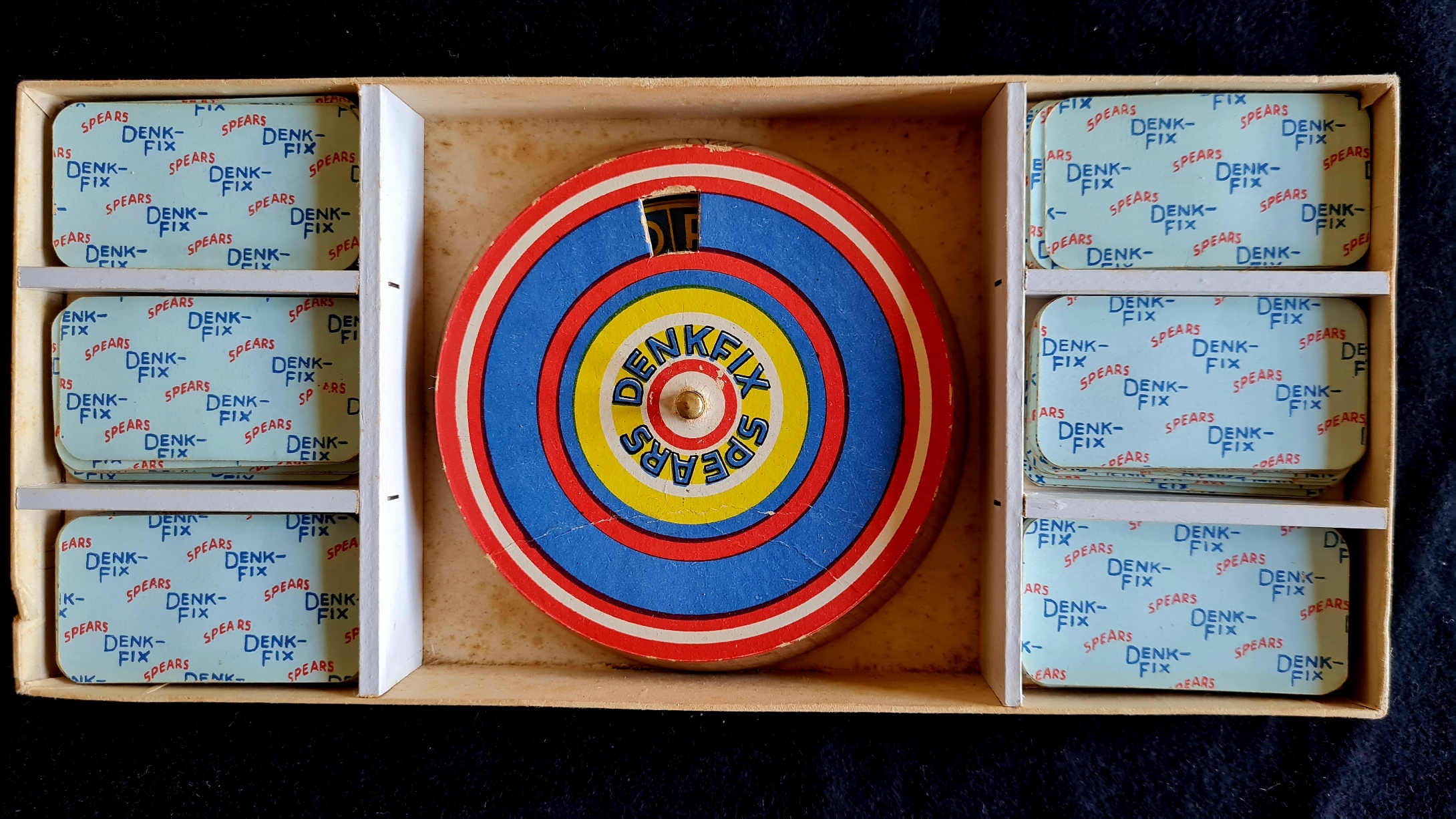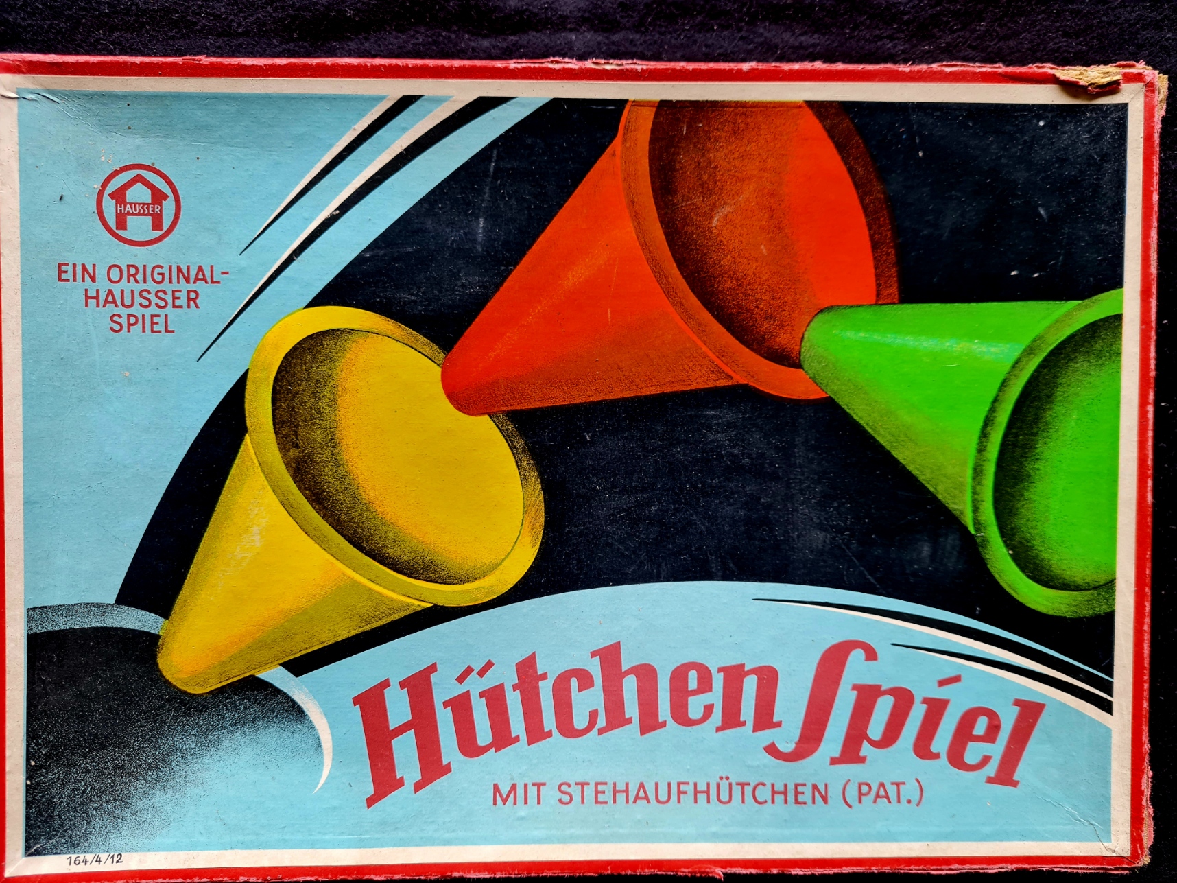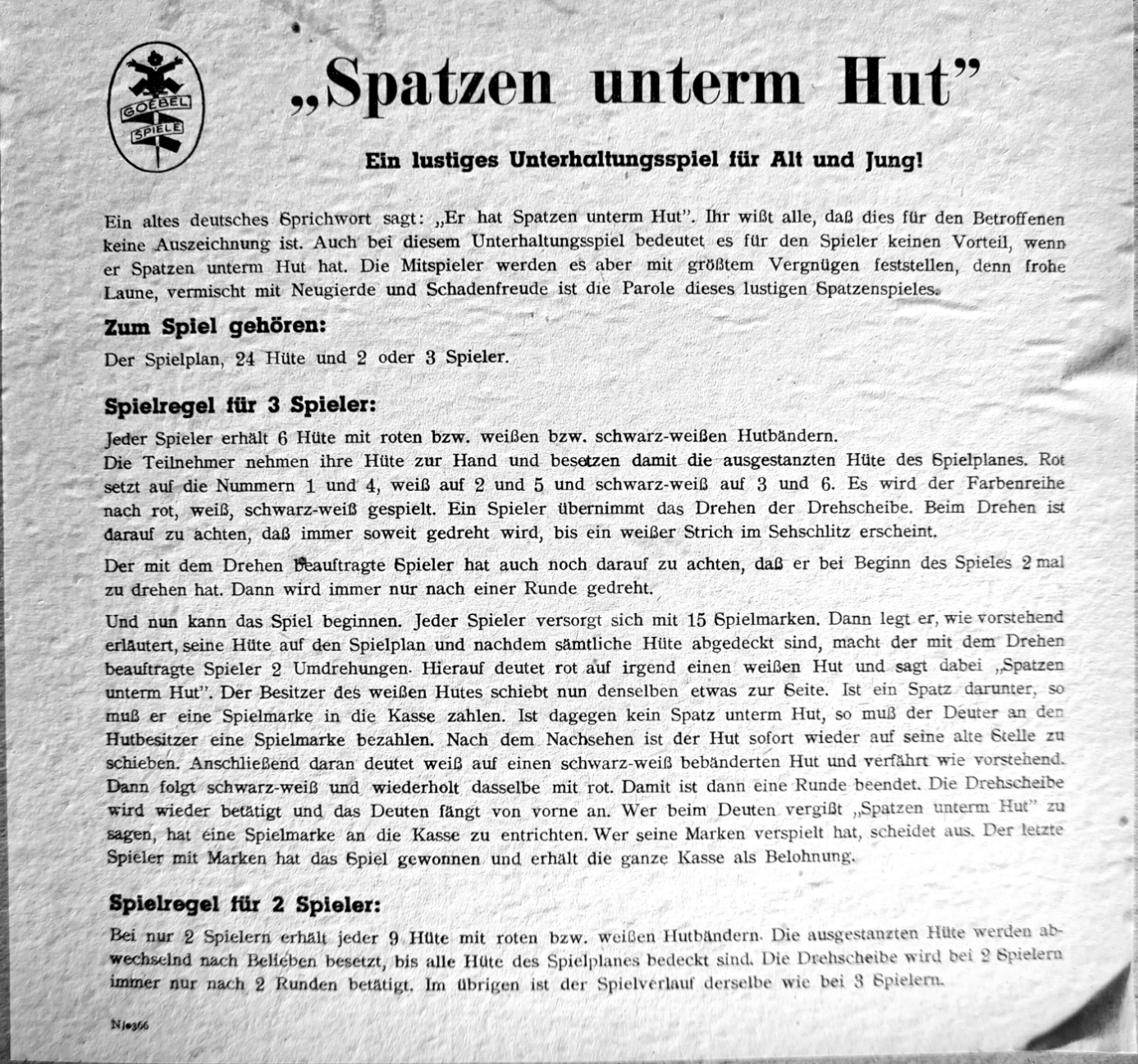 Ein auf dem memory-Prinzip basierendes Unterhaltungsspiel. Die Drehscheibe und die 24 Hüte (vollständig) sind gut erhalten. (Beliebige Spielmarken sollten bereit liegen).