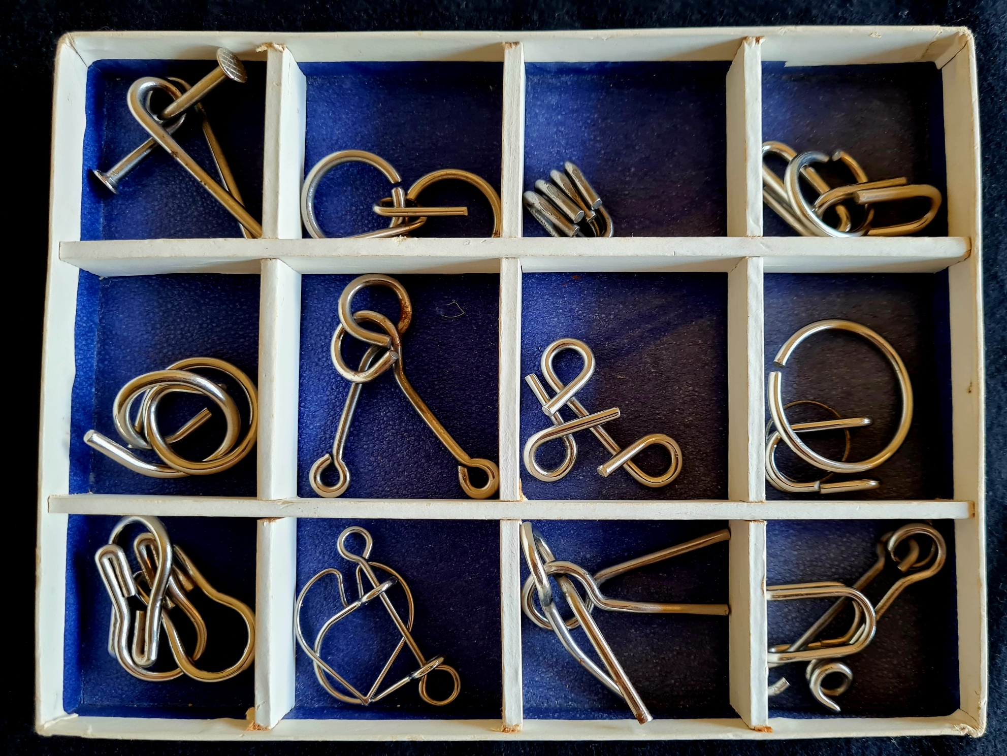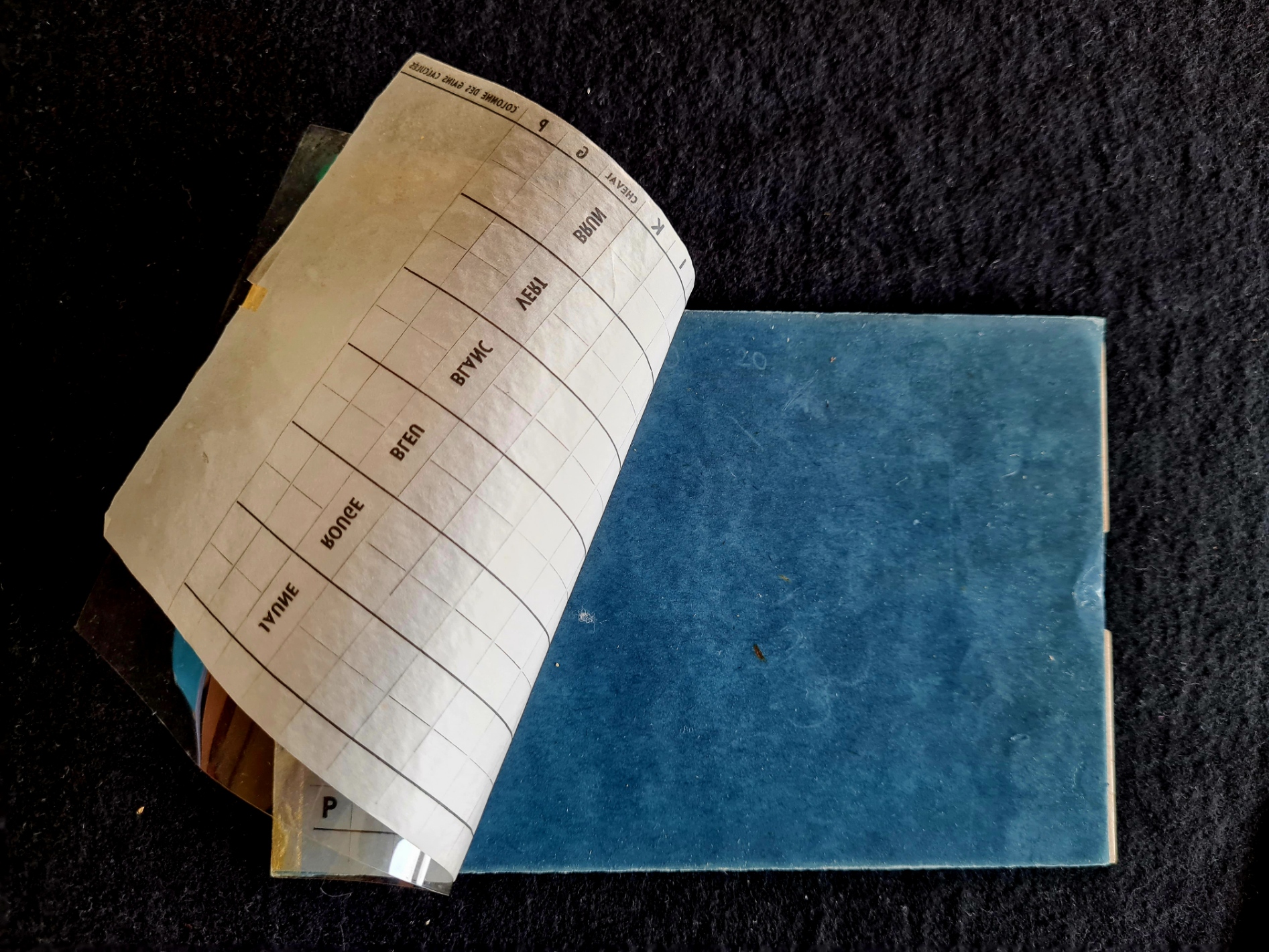 ZUSTAND: Innenraum: Vintage in sehr gutem Zustand (9/10) Alle Kartons sind in sehr gutem Zustand, außer einem (A3), der einen kleinen Riss auf der rechten Seite hat. Die Holzmarken sind in sehr gutem Zustand, die Stofftasche auch. Die Glasmarken sind in gutem Zustand, die meisten haben einige beschädigte Kanten.