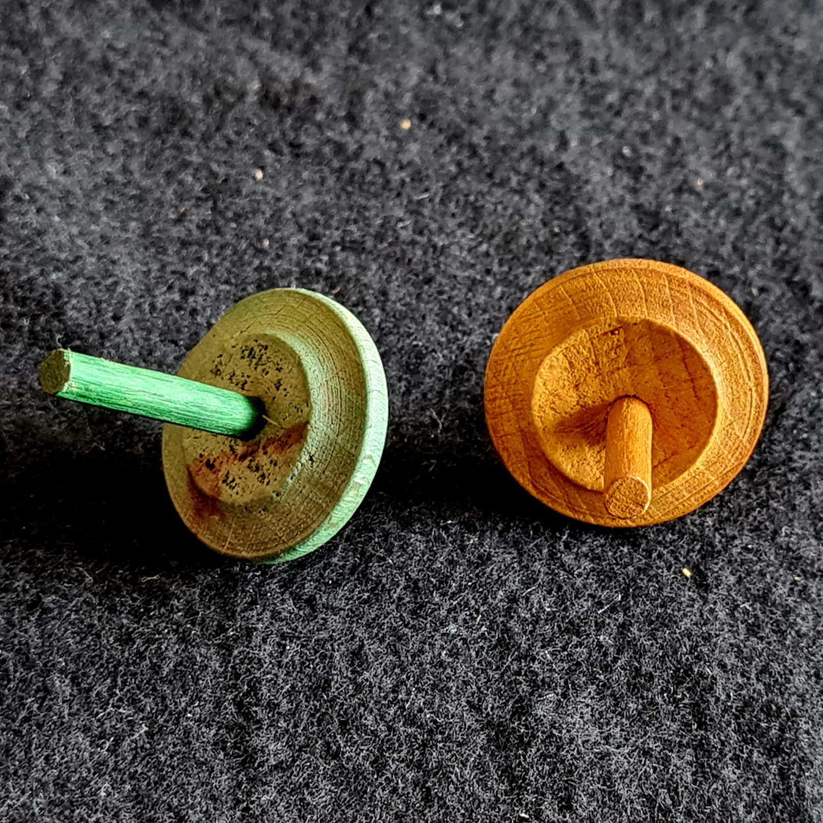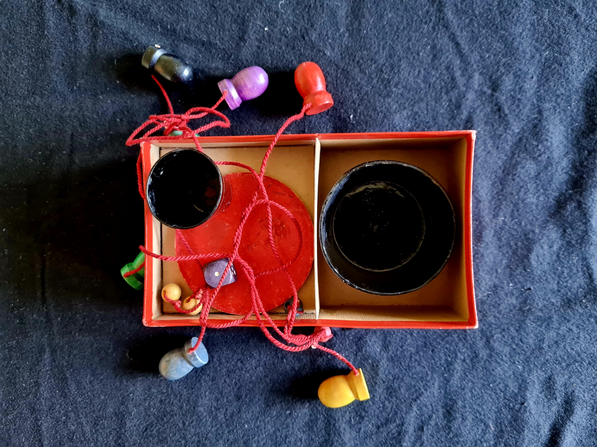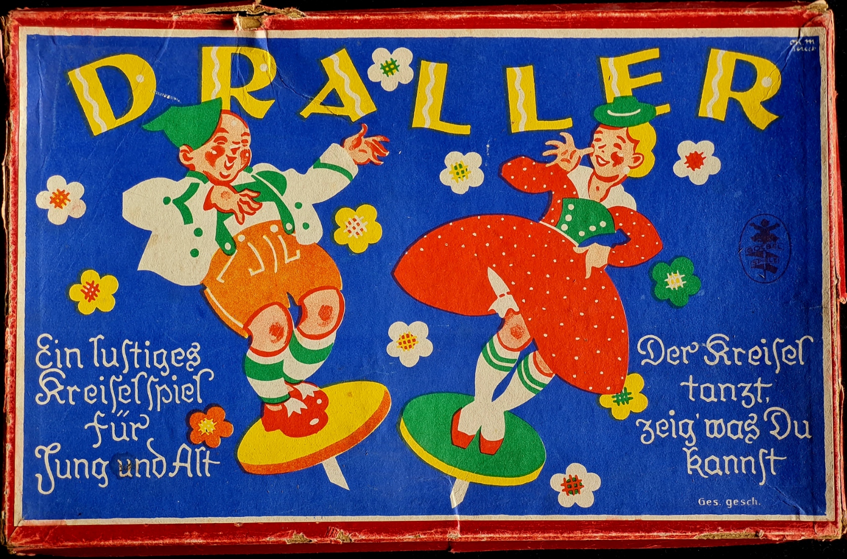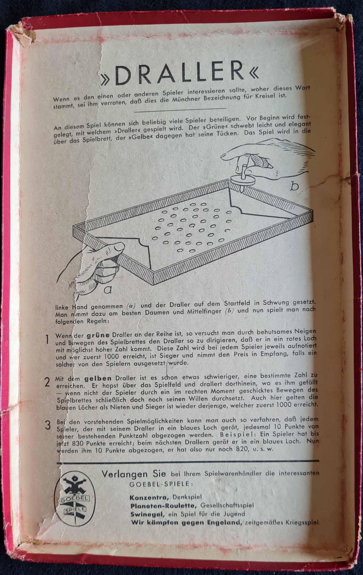 Goebel Geschicklichkeitsspiel, wahrscheinlich aus dem Jahr 1939. Kreiselspiel mit zwei unterschiedlichen Drallern (Münchner Bezeichnung für Kreisel).