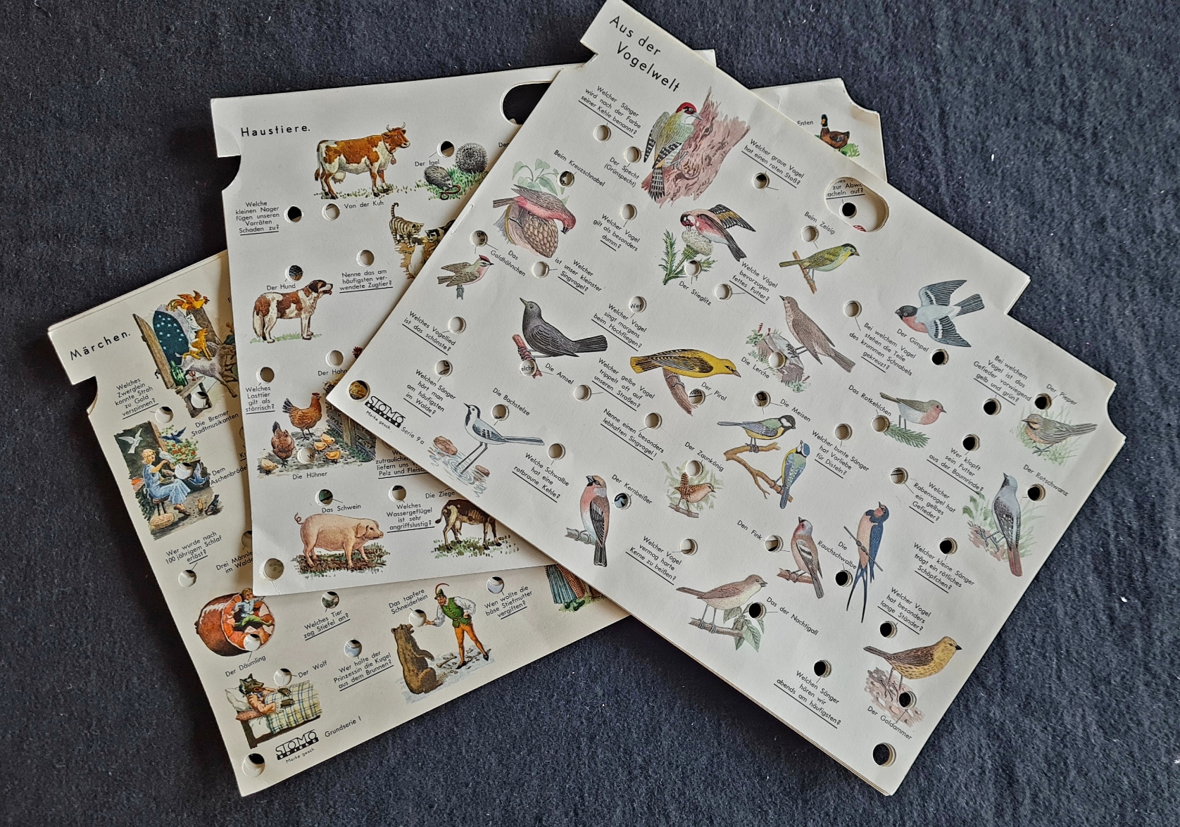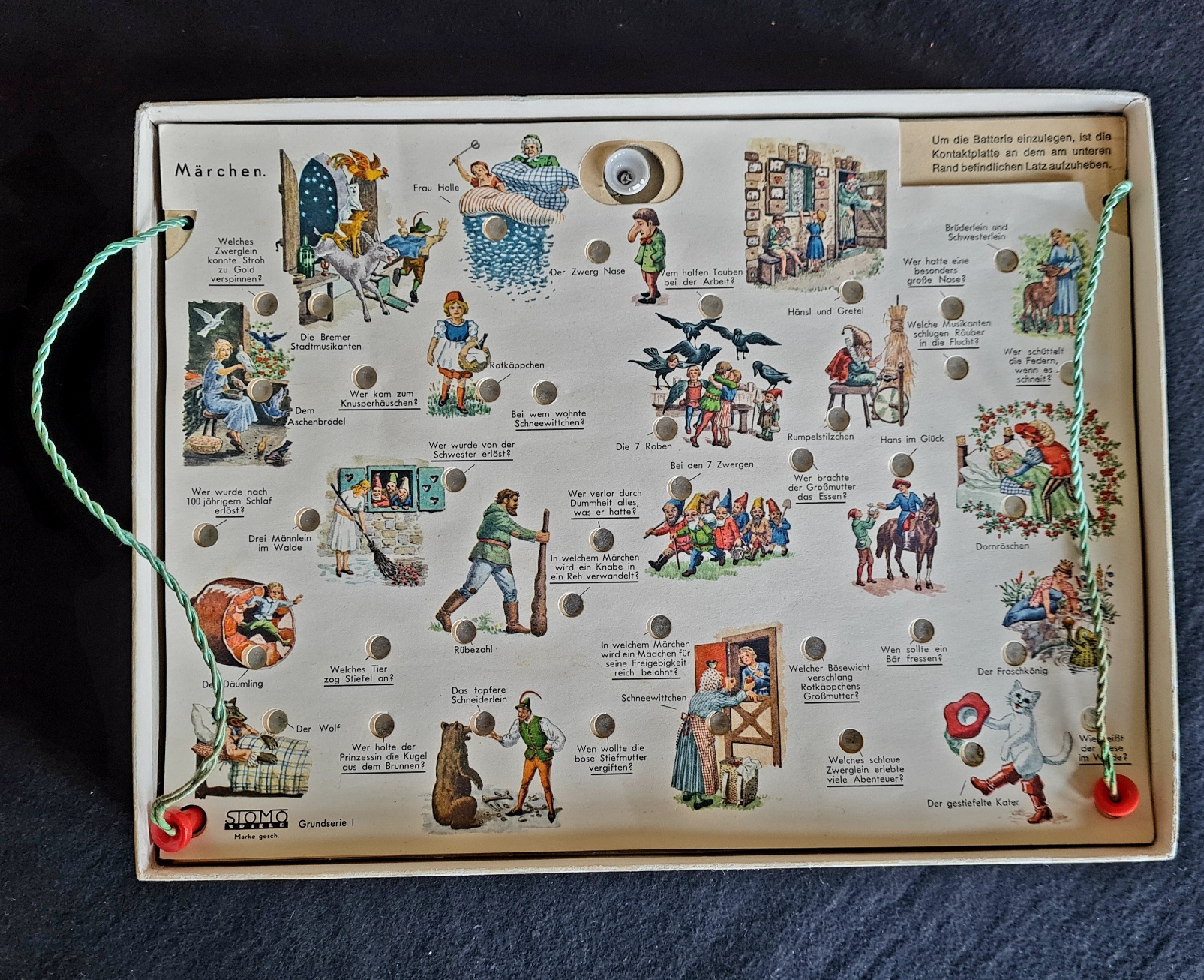 Für das Exemplar in der Spielesammlung sind drei vollständige Themenreihen vorhanden: - Grundserie mit Märchen, Haustiere, Tiere der Wildnis, Rechenaufgaben 1, Rechenaufgaben 2 - Serie 9 mit Aus der Vogelwelt, Schmetterlinge, Pflanzen, Maschinen, Tondichter - Serie 10 mit Schlösser, Gemüse, Klassiker Gemischte Fragen 1, Gemischte Fragen 2. Das Spiel ist funktionsbereit (Batterie gewechselt).