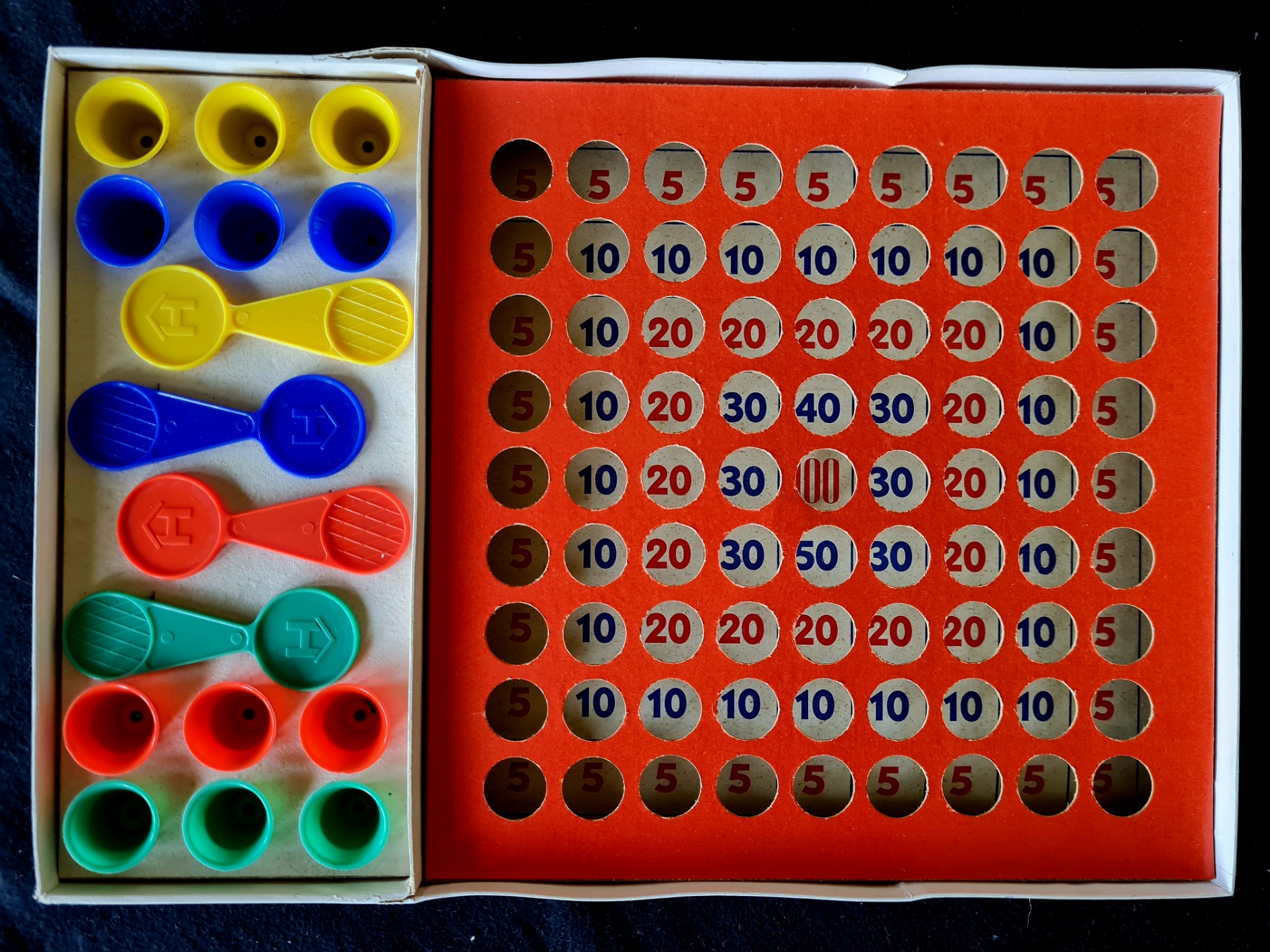 Das Wurfspiel für vier Personen von Hausser enthält vier Plastikwippen und jeweils drei kleine Stehaufhütchen in den Farben blau, rot, grün und gelb (vollständig).