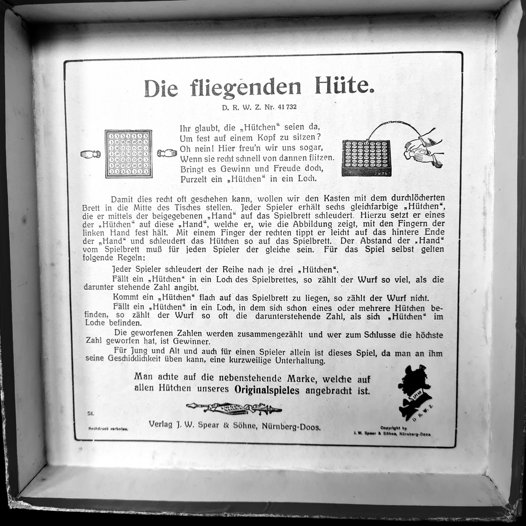 Noch Anfang 1938 war J. W. Spear & Söhne mit seinen Spielen im Exportgeschäft tätig, wie ein Wechsel für eine Lieferung an einen Händler in Spa (Belgien) belegt. Nach der Reichsprogromnacht vom 9. auf den 10. November 1938 wurde der in diesem Zusammenhang ins Konzentrationslager Dachau verbrachte jüdische Eigentümer des deutschen Unternehmenszweigs von J. W. Spear & Söhne, Hermann Spear (Bruder Richard Spears), auf der Grundlage der Verordnung zur Ausschaltung der Juden aus dem deutsche Wirtschaftsleben gezwungen, sein Unternehmen zu einem Bruchteil seines Marktwertes zu verkaufen . Beteiligt an diesem Raubzug waren die Deutsche Arbeitsfront (DAF), Kreisverwaltung Nürnberg-Stadt, und als genehmigende Behörde die Regierung von Ober- und Mittelfranken. Käufer war Hanns Porst, der seit 1919 in Nürnberg erfolgreich im Fotogeschäft (Photo Porst) tätig war und das Unternehmen provisorisch mit Wirkung vom 13. Dezember 1938 übernahm. Dabei erhielt die Familie Spear nicht einmal den vom „Arisierungs“-Gutachter festgesetzten minimalen Kaufpreis. Der noch zusammen mit seiner christlichen Ehefrau Else und ihren gebrechlichen Eltern in Nürnberg lebende Firmeninhaber wurde trotz seines 1942 erklärten Übertritts zum Christentum 1943 nach Ausschwitz deportiert, wo er am 10. Juli 1943 ermordet wurde. Auch elf weitere Familienmitglieder wurden vom nationalsozialistischen Staat ermordet. Im „arisierten“ Unternehmen wurden – wie in vielen anderen deutschen Spieleverlagen in jener Zeit auch – kriegshetzerische Spiele, wie „Kurs Ost-Nordost“ (1939, Porst-Spiel 20651) sowie „U-Boote fahren gegen England“ (1940) und „Bomben auf England“ (1940, Spear-Spiel 26681) entwickelt. […] Porst versuchte, ab Mai 1940 den mit dem jüdischen Firmengründer verbundenen Markennamen „Spear“, den er wegen seiner Bekanntheit zunächst weiter benutzte, in einen Werbespruch umzuwandeln: „Spiele, aber richtig!“, um die Herkunft des Unternehmens zu verschleiern. Die Spielanleitungen wurden nun sehr oft mit dem Schriftzug „Euer Onkel Hanns“ gezeichnet, um den spielenden Kindern den neuen Firmeninhaber als väterlichen Freund zu präsentieren.Nach dem Zweiten Weltkrieg dauerte es bis Mitte der 1950er Jahre, bis die Witwe Hermann Spears und die Familie Spear das teilweise kriegszerstörte Unternehmen zurückbekamen. Der Nürnberger Spielehersteller, der nun als Tochtergesellschaft des englischen Haupthauses fungierte, produzierte dann wieder auf beachtlichem Niveau, konnte jedoch die Marktbedeutung aus der Zeit vor 1933 nicht wieder erreichen. 1978 wurde die Firma in Spear-Spiele GmbH umgewandelt und schloss sich aufgrund wirtschaftlichen Drucks mit dem Spielehersteller L. Kleefeld & Co.L. zusammen. Die Produktion wurde am 31. Dezember 1984 am Nürnberger Standort eingestellt. https://de.wikipedia.org/wiki/J._W._Spear_%26_S%C3%B6hne
