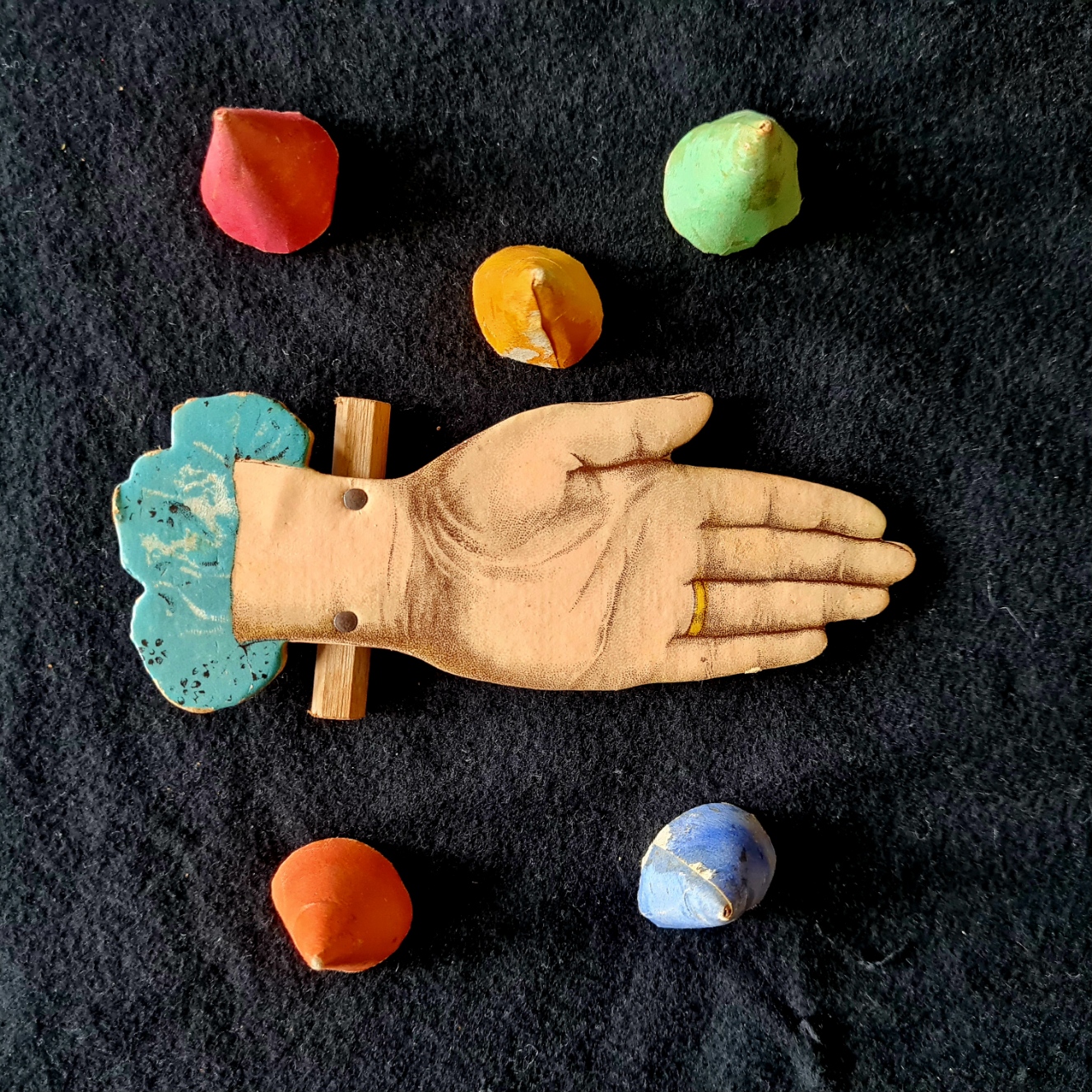 Aufgrund der vielen Varianten von Die fliegenden Hüte gab, ist eine genaue Datierung des Sammlungsexemplars nicht möglich. Es handelt sich sicher um eine ältere Ausgabe mit einer Hand. Ob es sich bei den Hütchen (jeweils eines statt sechs in fünf verschiedenen Farben) um Originalhütchen handelt, ist ebenfalls unklar.
