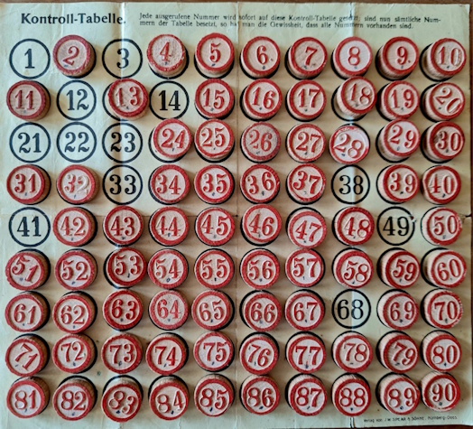Die 18 Lottotafeln bestehen aus drei Serien von jeweils 6 Kartons mit drei Reihen von fünf Zahlen. Jede Serie ist so gestaltet, dass die Zahlen 1 bis 90 jeweils einmal auftreten (6 x 3 x 5) - etwa durch Zufallsauswahl ohne Zurücklegen.