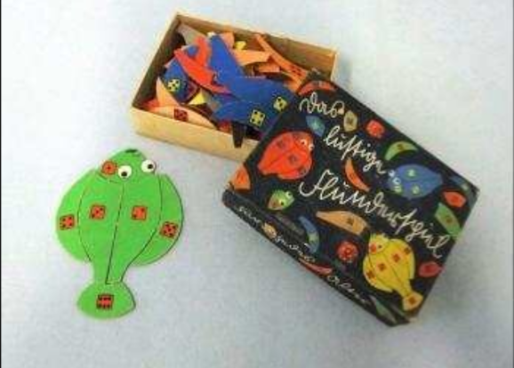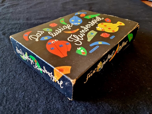 Würfelspiel. Schwarze Verpackung auf der die bunten Spielteile und Würfel abgebildet sind. Der Spieletitel in Sütterlin. Inhalt: 12 Flundern aus Karton, die jeweils aus sechs Teilen bestehen, müssen von den Mitspielern zu vollständigen Flundern mit Hilfe zweier Würfel (nicht im Spielekarton vorhanden) zusammengesetzt werden. Spielebeschreibung ist in den Deckel der Verpackung eingeklebt. Die Anleitung ist mit “Euer Onkel Hanns” unterschrieben, Hanns Porst (Begründer der Fotoladenkette Porst) erwarb das gutgehende Unternehmen 1938 von der jüdischen Familie Spear, das diese durch Zwangsverkauf aufgeben musste. Es fehlen je ein Flossen- und ein Bauchteil.
