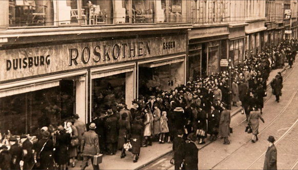 1879 eröffnete Heinrich Roskothen eine Korbhandlung in Essen. Der gelernte Korbmacher verkaufte zunächst seine selbstgemachten Waren in Hattingen, bis er zwei Jahre später nach Duisburg zog und sich vollkommen auf den Einzelhandel konzentrierte. Der Korbpuppenwagen war der Anfang, der dann zum Verkauf von Spielzeug führte. Das war der Beginn einer langen Tradition in Essen und auch Duisburg. Als im Zweiten Weltkrieg die Stadt Duisburg zu 80 Prozent zerstört wurde, traf es auch die Firma Roskothen. Bombenangriffe in den Jahren 1941 und 1944 verursachten schwere Schäden am Gebäude.