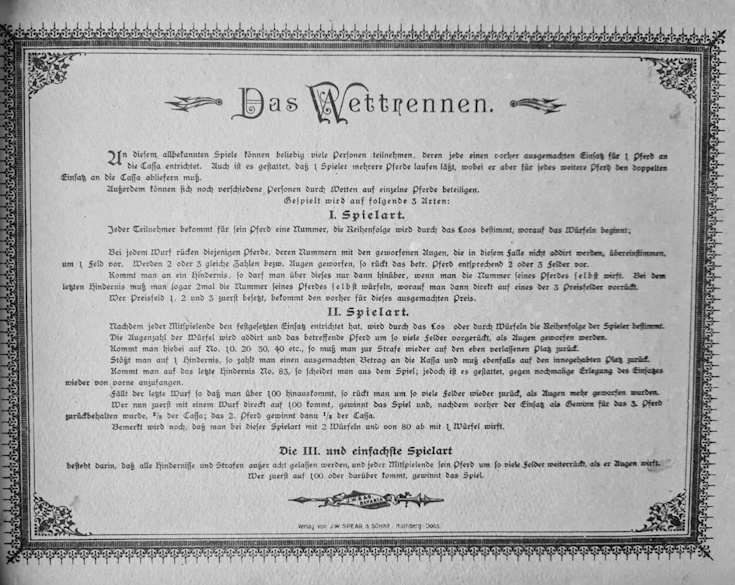 Mindestens zwei Varianten von Pferderennen mit der Verlagsangabe J.W.Spear & Söhne sind in der Spielesammlung vorhanden. :