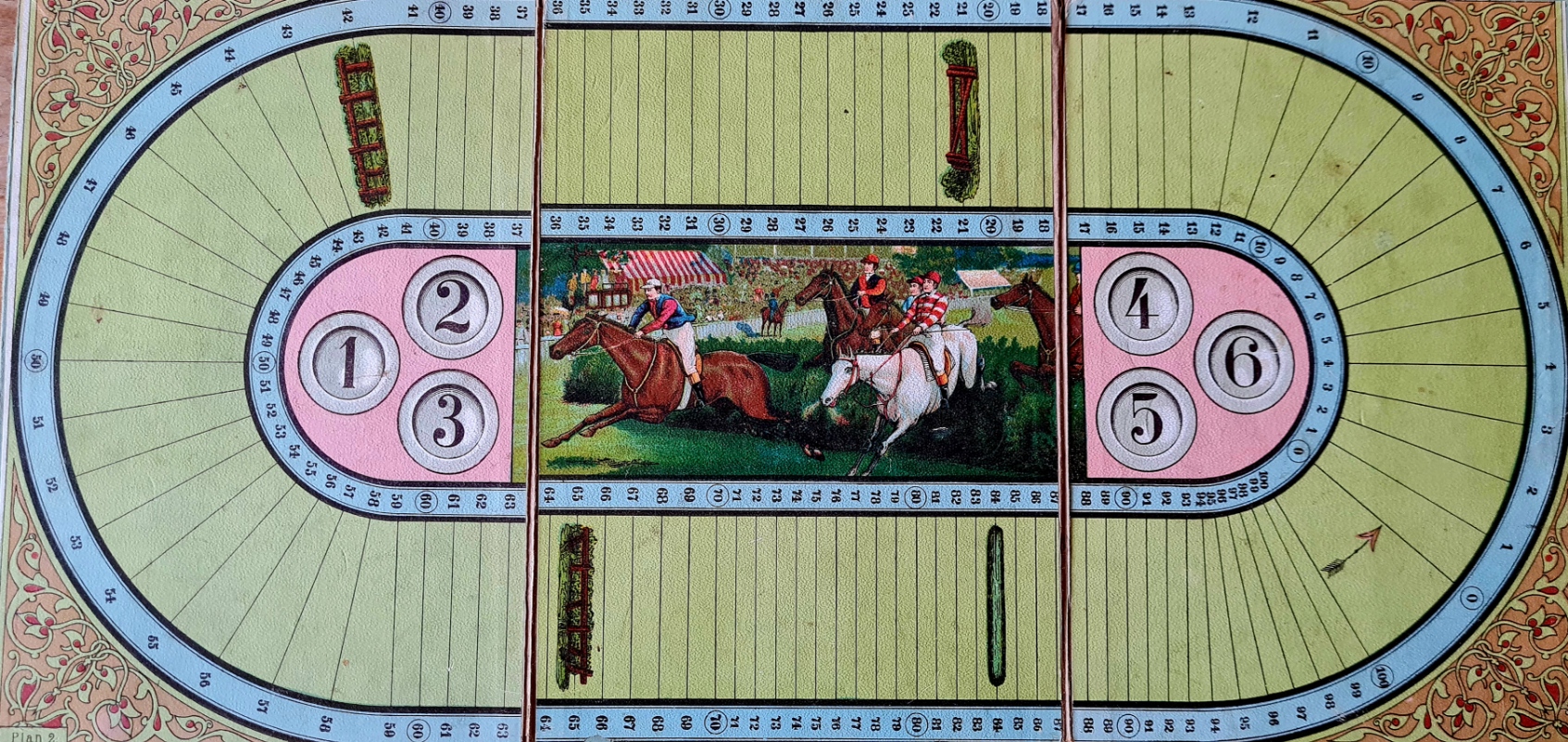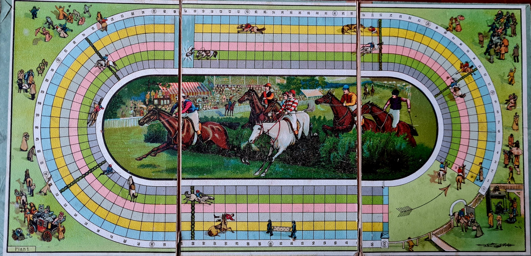 Antikes Wettrenn-Spiel von ca. 1900, Verlag J. W. Spear&Söhne, Nürnberg, Doos. 3-fach gefaltetes Spielbrett mit Spielvorlage auf Vorder- und Rückseite des Deckels, 6 Reiterfiguren aus Metall, gut erhalten. Ausführliche Regeln und Anleitung auf der Innenseite des Deckels in altdeutscher Schrift. Eine Spielkarte Nr. 3 fehlt, der Karton ist defekt.