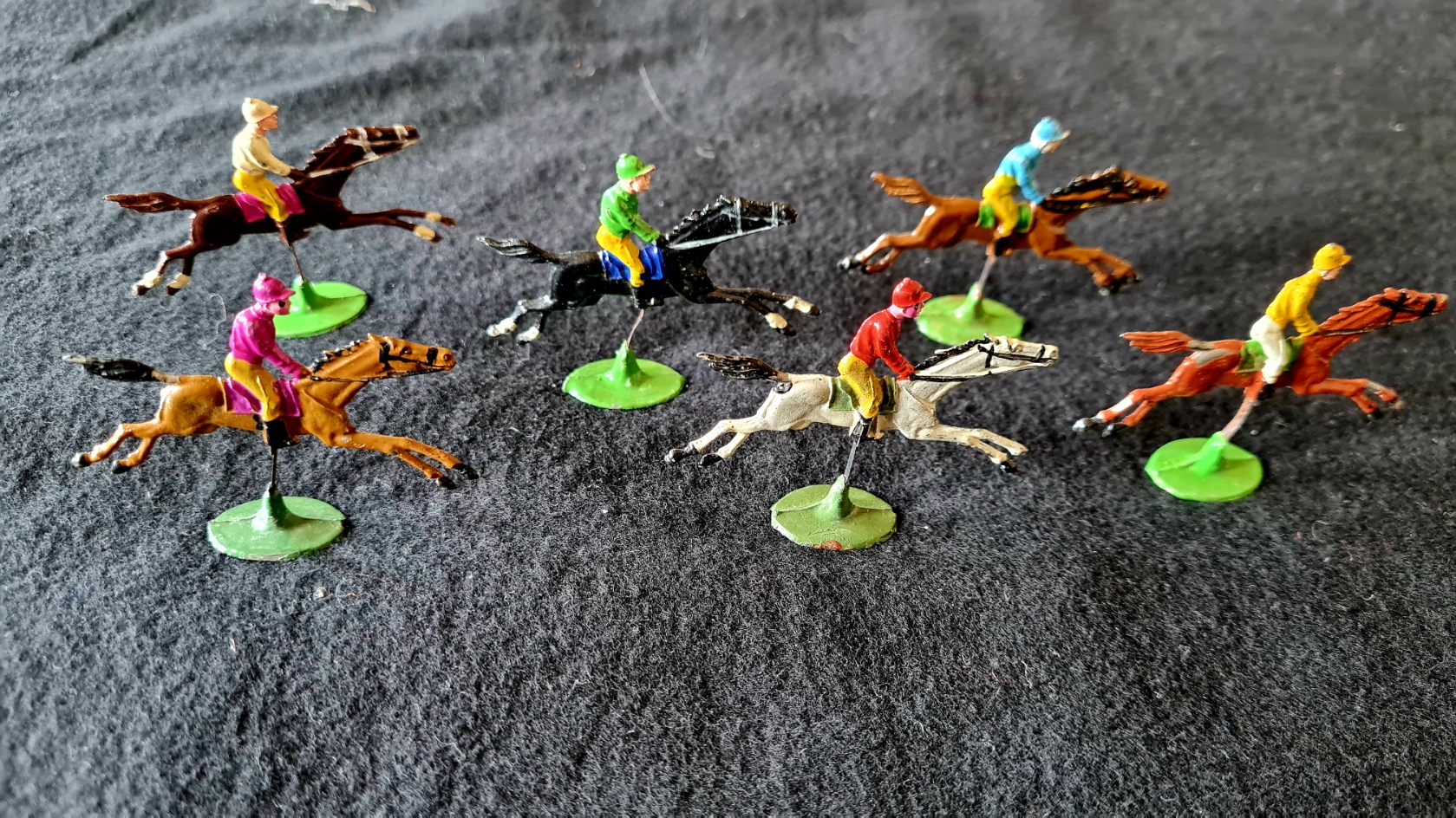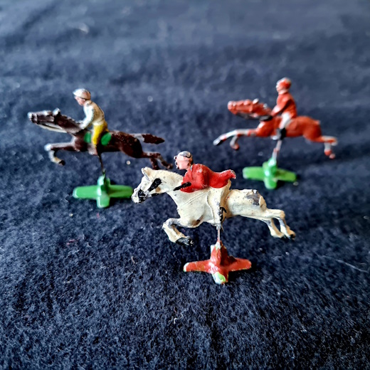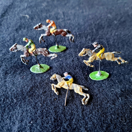 Diese ältere Variante ist relativ gut erhalten (Schachtel beschädigt). Neben 3 vollständigen originalen Reiterfiguren und einer Figur ohne Fuß (starr, unbeweglich) befinden sich 3 weitere Metallfiguren unbekannter Herkunft (auf Metallfeder beweglich), ein doppelseitiger Spielplan, 6 Spielkarten sowie 3 Würfel in der Spielschachtel. Die Spielregel befindet sich auf der Deckelinnenseite.