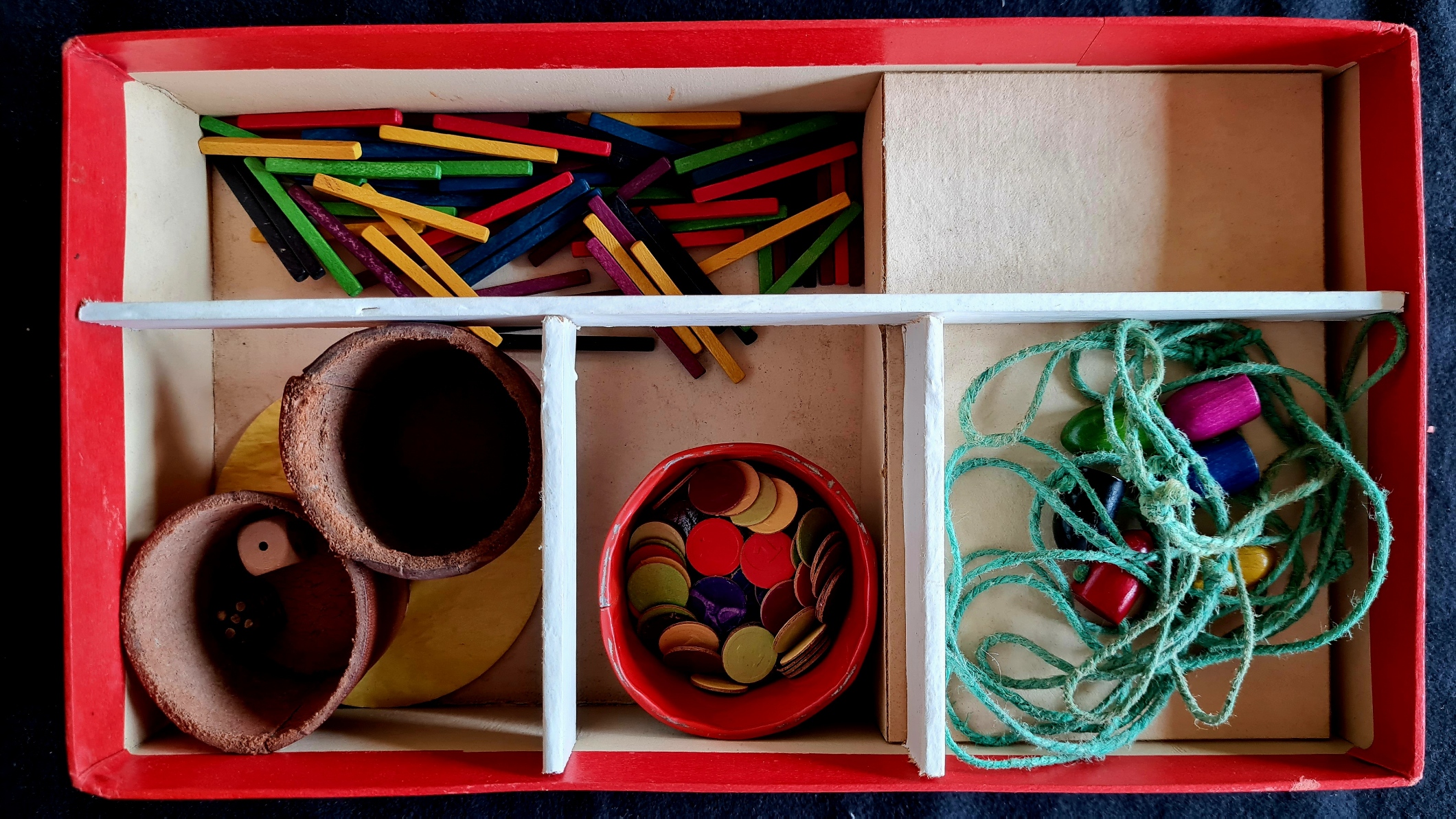 Das Lottospiel, das wir mit Bingo vergleichen könnten, besteht aus 18 Spielkarten, einem Stoffbeutel für die Chips, 90 nummerierten Holzchips (1-90) und einer Schachtel mit Glaschips für die Karten. Die Spielanleitung ist auf Papier gedruckt, das auf die Schachtel geklebt wird. Der Deckel der Box dient als Bedienfeld. Die Boxteiler sind aus Holz, während die Box selbst aus sehr hartem kastanienbraunem Karton mit silberfarbenen Buchstaben besteht.