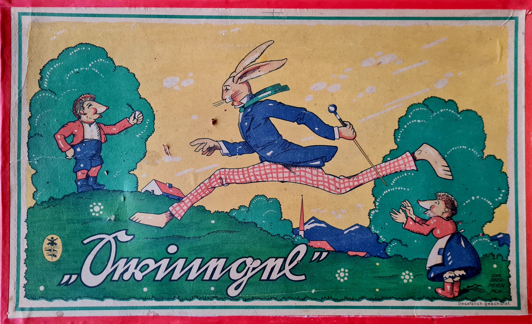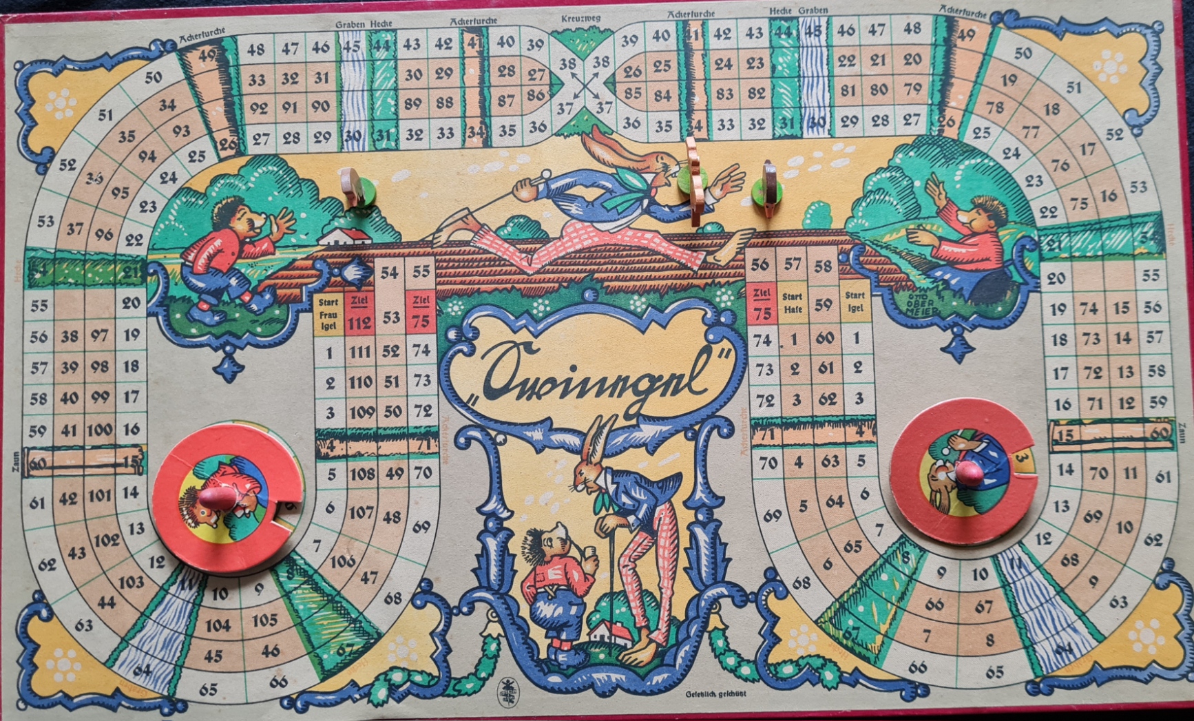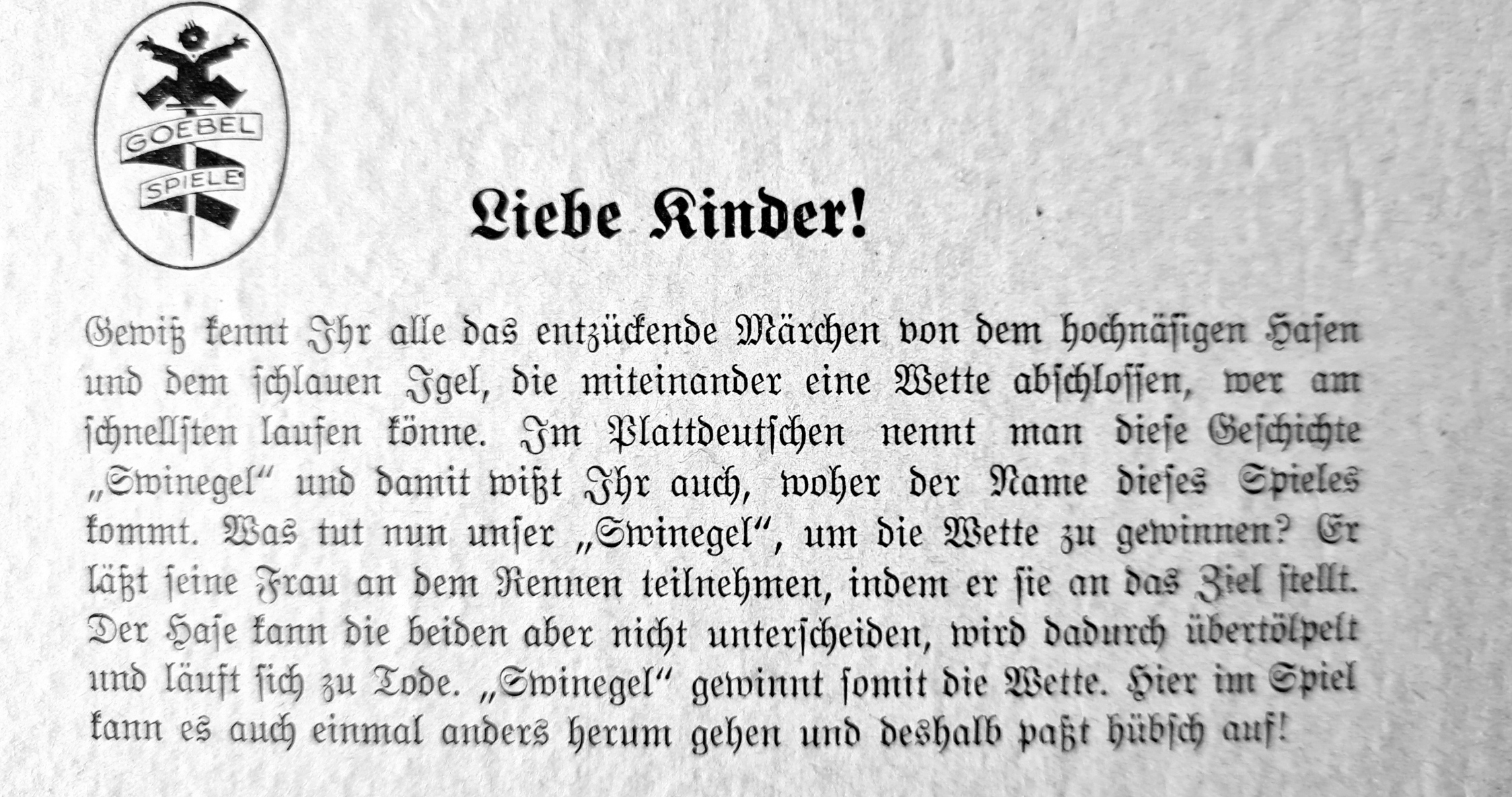 Ein Laufspiel nach dem Märchen von dem hochnäsigen Hasen und dem schlauen Igel (Plattdeutsch Swinegel). Das Spiel ist vollständig und relativ gut erhalten. Neben denn leichten Schäden an der Spieleschachtel ist lediglich die Befestigung eines Würfelkreisels defekt.