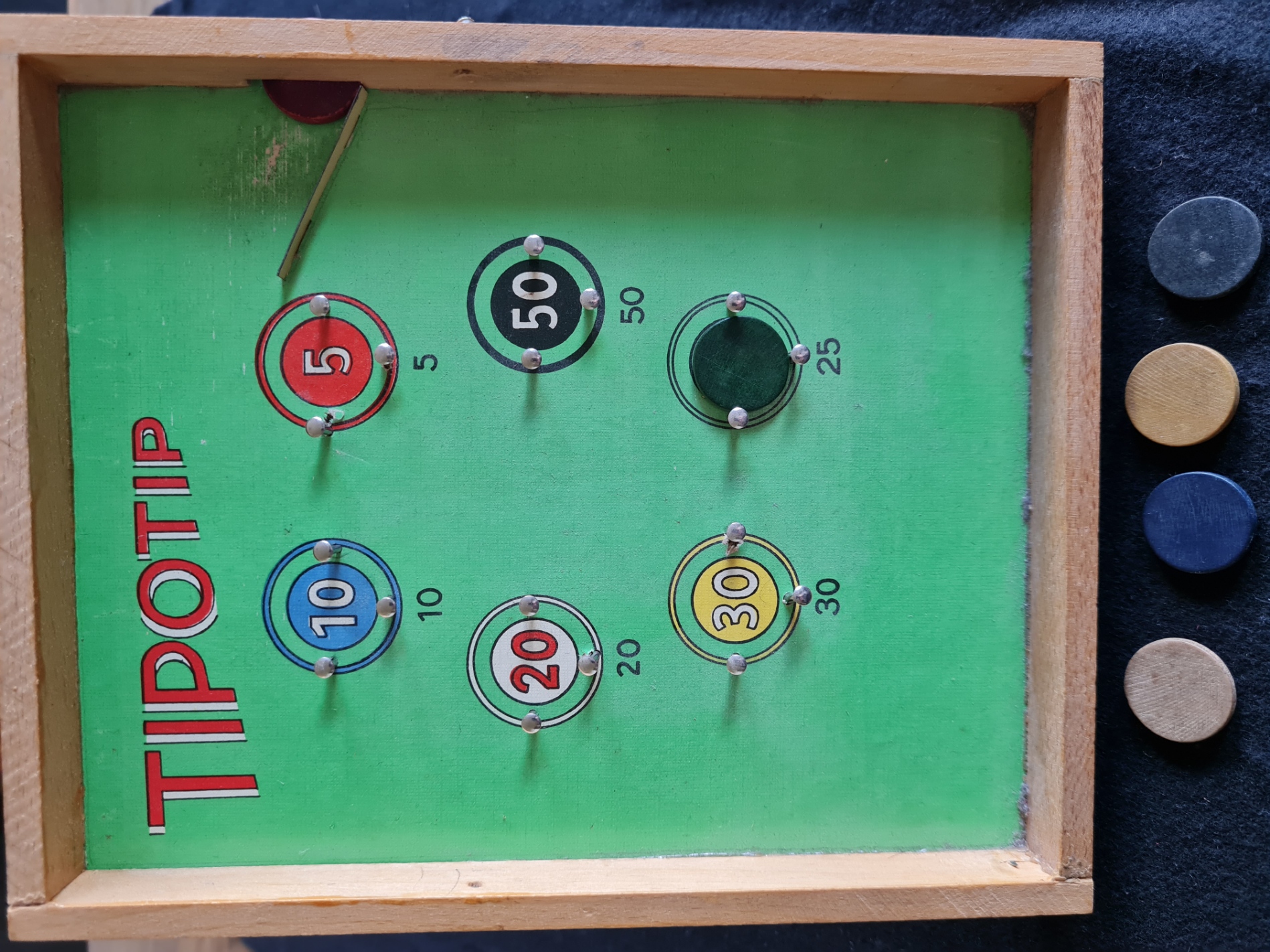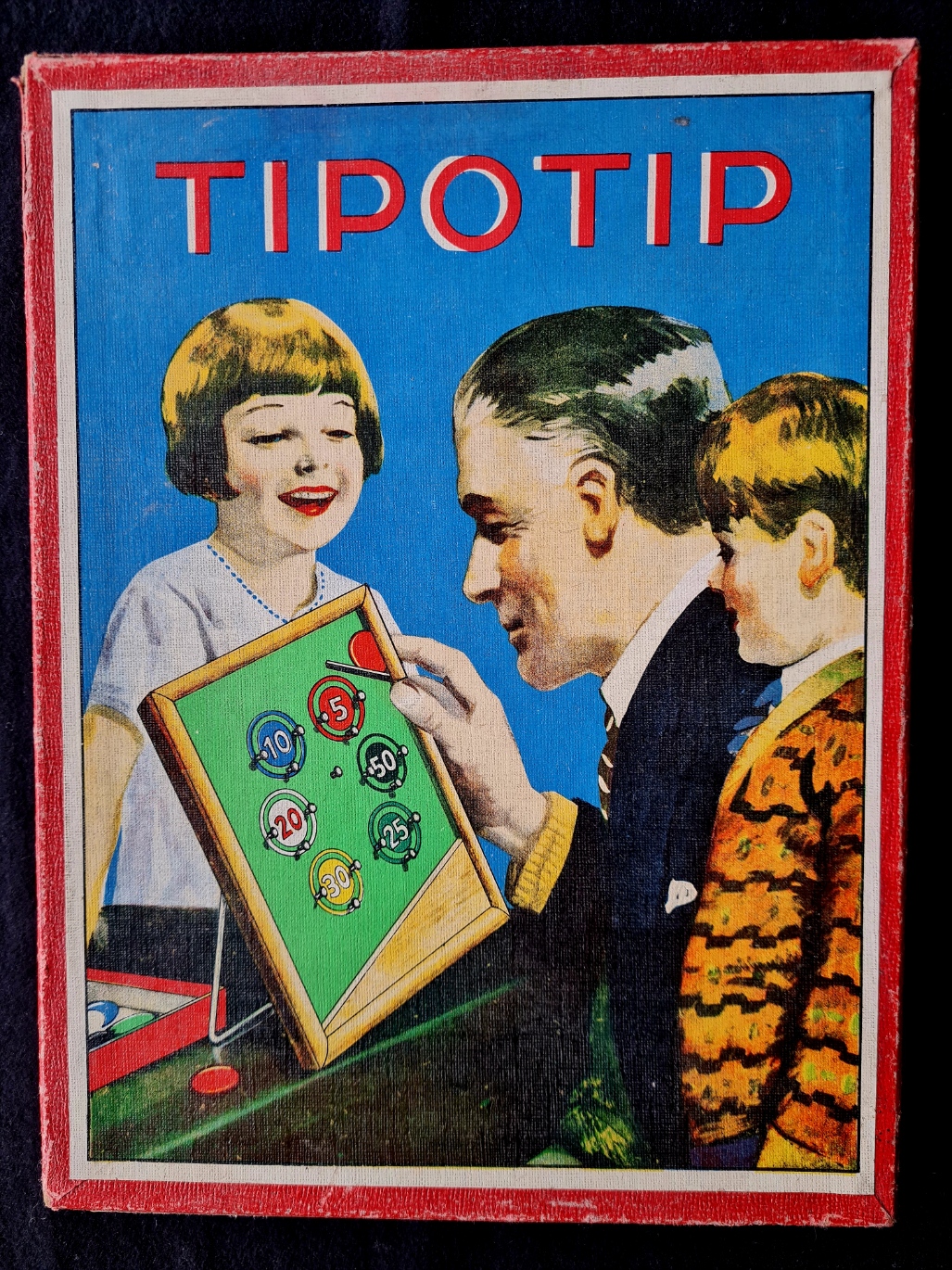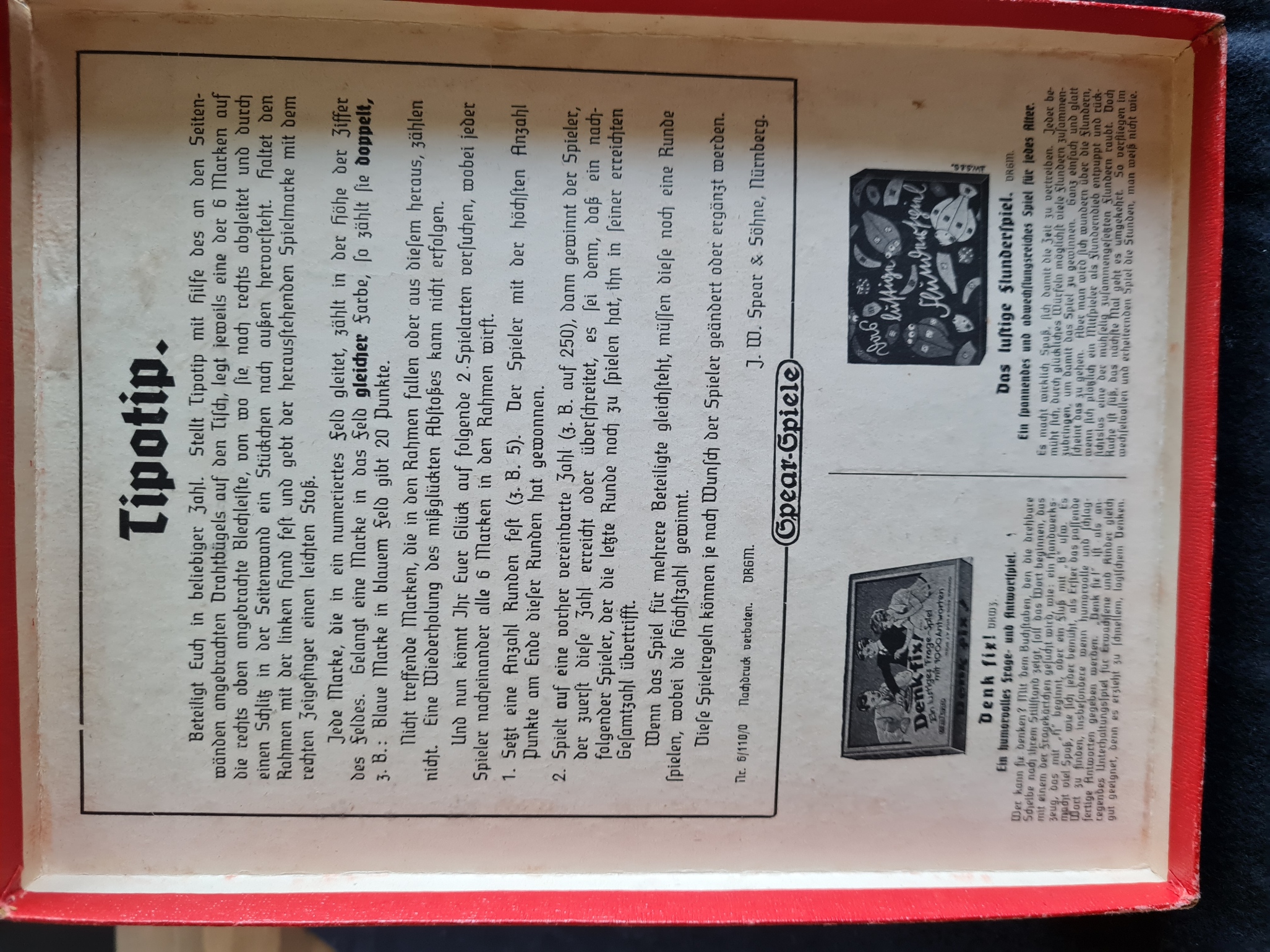 Tipotip könnte als Vorläufer der Fingerschlagspiele bezeichnet werden. Eine aus dem Rahmen herausstehende Spielmarke wird mit einem kleinen Stoß des rechten Zeigefingers auf das Spielfeld geschleudert. Das Exemplar ist vollständig und sehr gut erhalten. Interessant auch der Reklamehinweis auf das Spear-Spiel Das lustige Flunderspiel mit Deckelbeschriftung in Sütterlin Schrift.