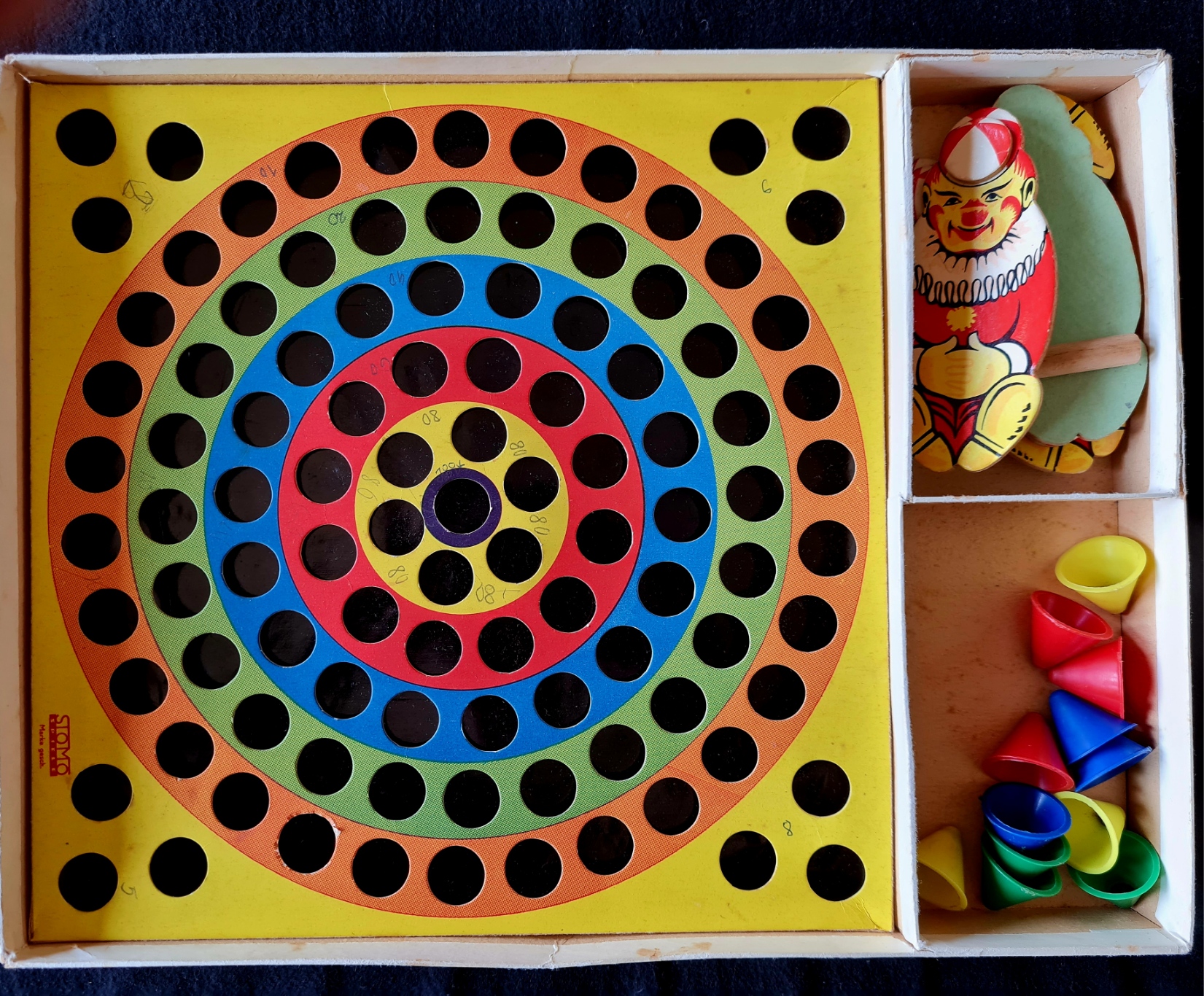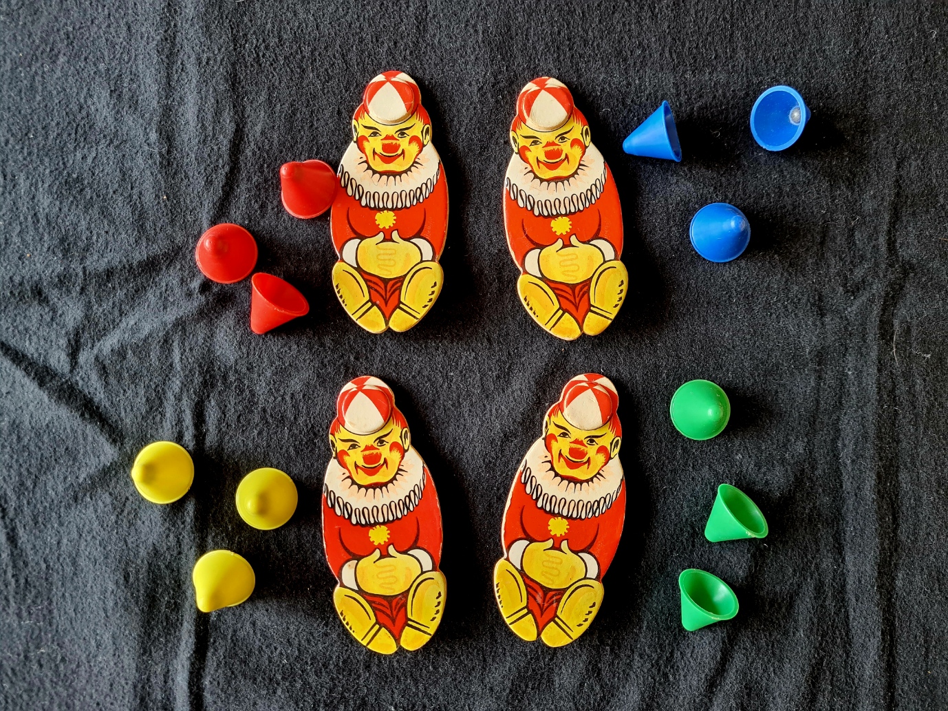 Das Wurfspiel für vier Personen von STOMO enthält vier Schleuderfiguren (Clowns) mit jeweils drei Clownmützen in den Farben blau, rot, grün und gelb (vollständig).