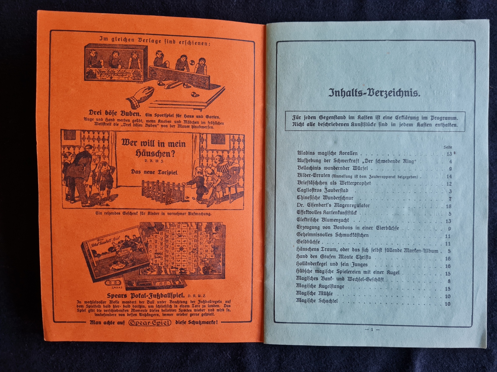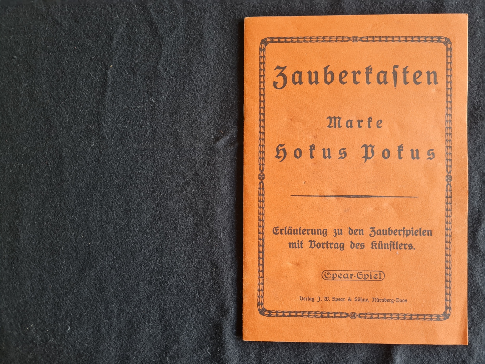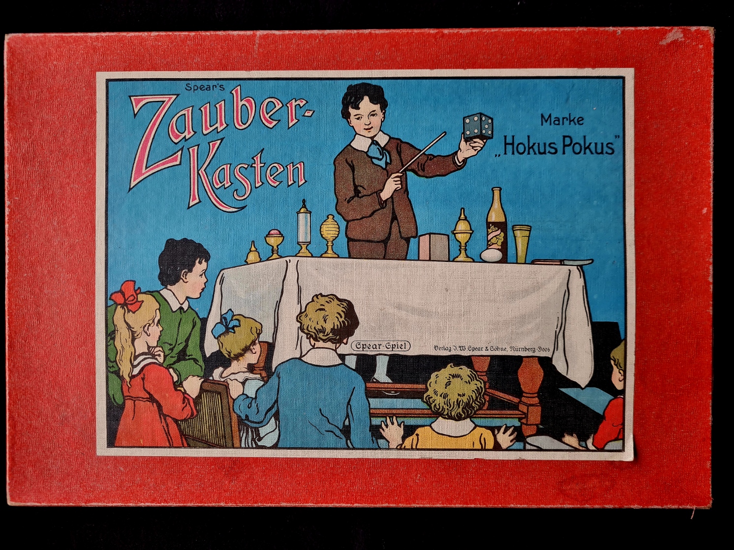 Spear’s Zauberkasten Marke “Hokus Pokus” ist um 1930 entstanden; das Exemplar aus der Spielesammlung ist sehr gut erhalten und vollständig; die 19-seitige Erläuterung zu den Zauberspielen enthält auch einige Hinweise auf weitgehend unbekannte Spear-Spiele aus dieser Zeit.