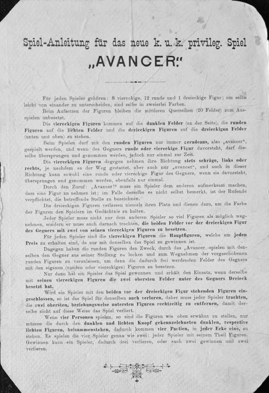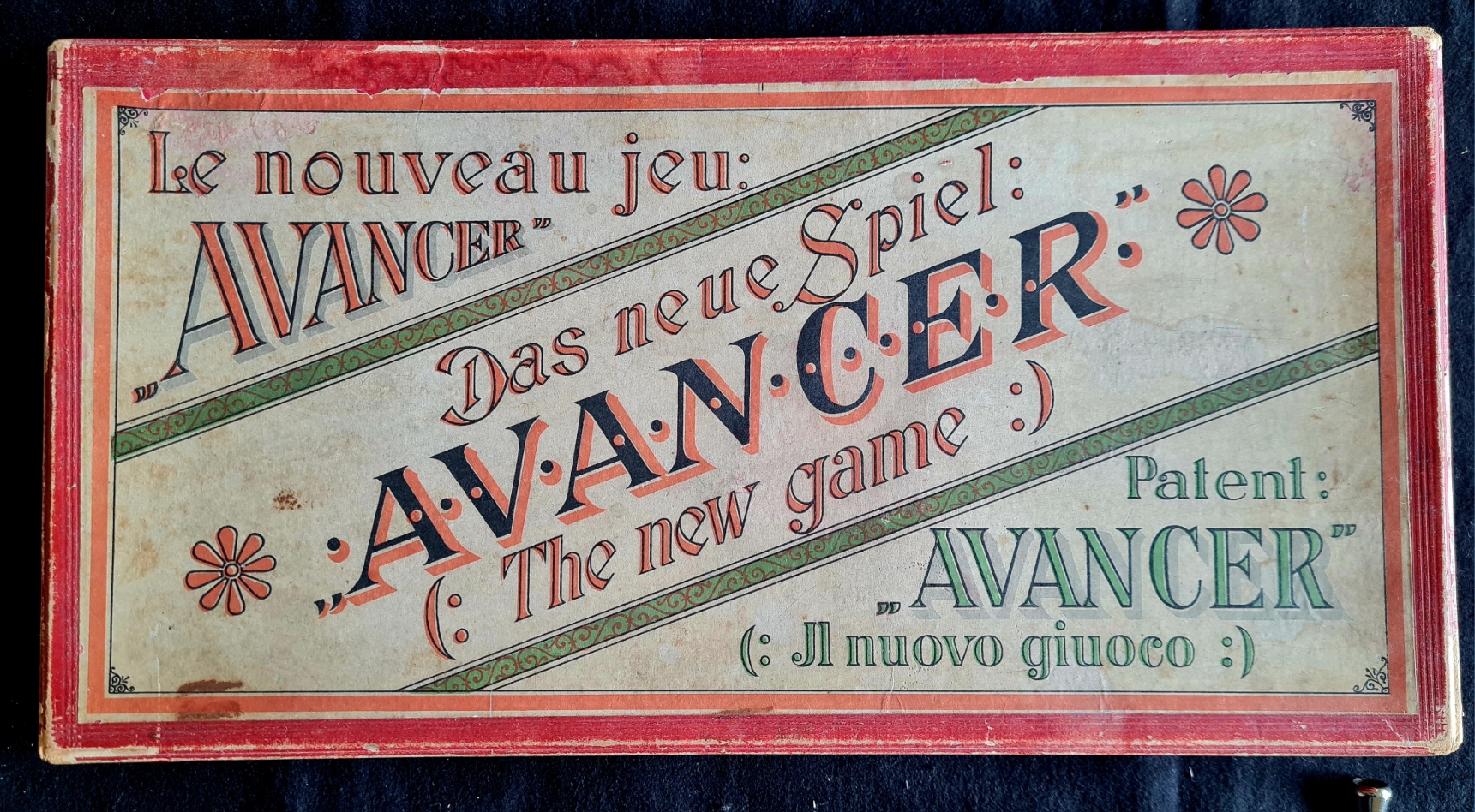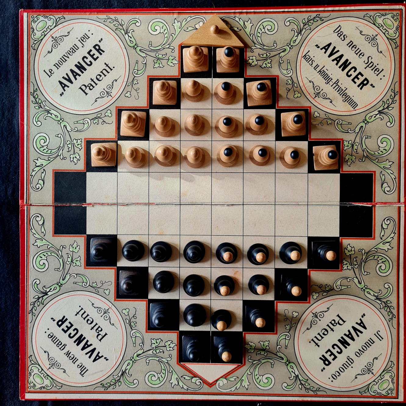 Keinerlei Hinweise konnten für das Spiel „AVANCER“ gefunden werden. Das in der Anleitung als das neue k. u. k. privileg. Spiel bezeichnete Spiel wird bereits auf dem Schachteldeckel in vier Sprachen (Deutsch, Englisch, Französisch und Italienisch) angekündigt. Neben den 2x20 sorgfältig gearbeiteten Figuren aus Holz (zwei zusätzliche dreieckige Figuren dienen nur zur Markierung - eine fehlt) fällt auch die ungewöhnlich professionelle Verarbeitung der Spieleschachtel auf. „AVANCER“ (Zuruf, wenn vergessen wurde eine Figur zu nehmen ) reiht sich in die klassischen Brettspiele wie Schach und Dame und die um 1900 erfundenen wie Halma und Salta ein.