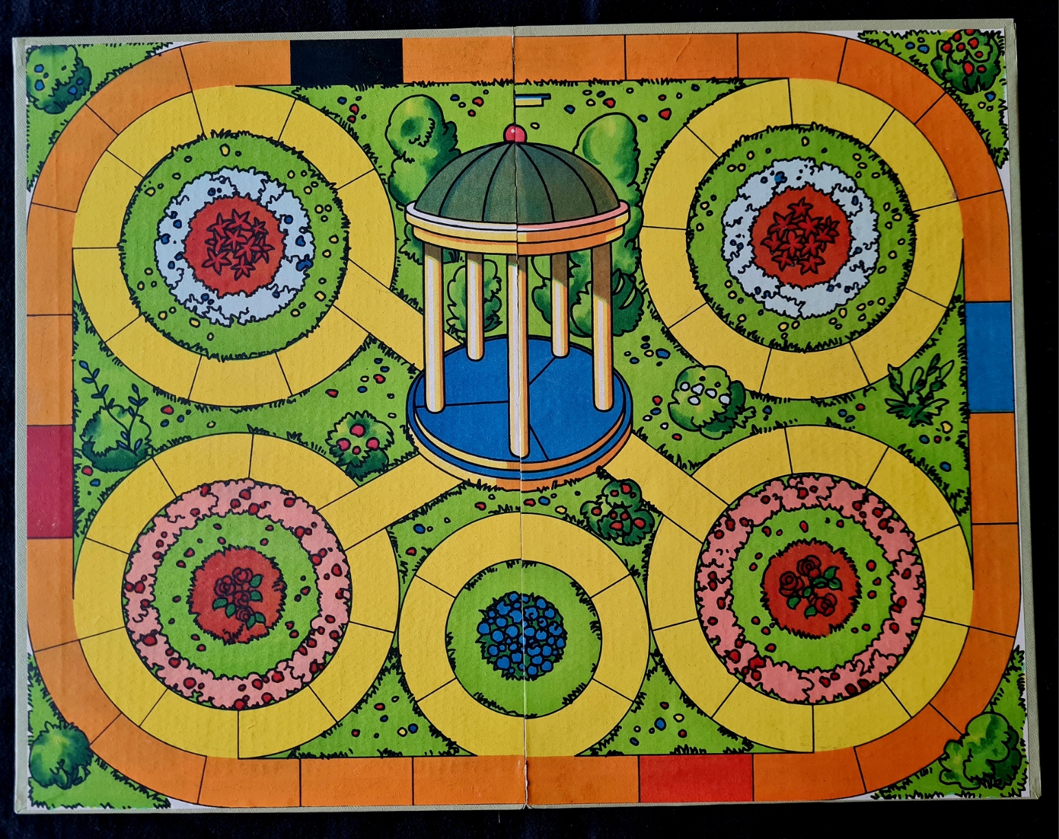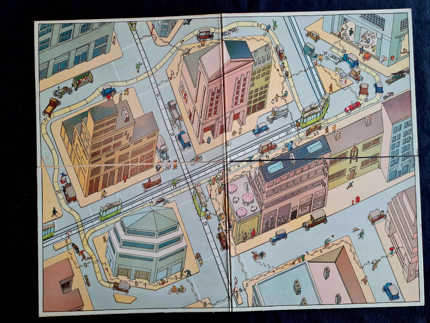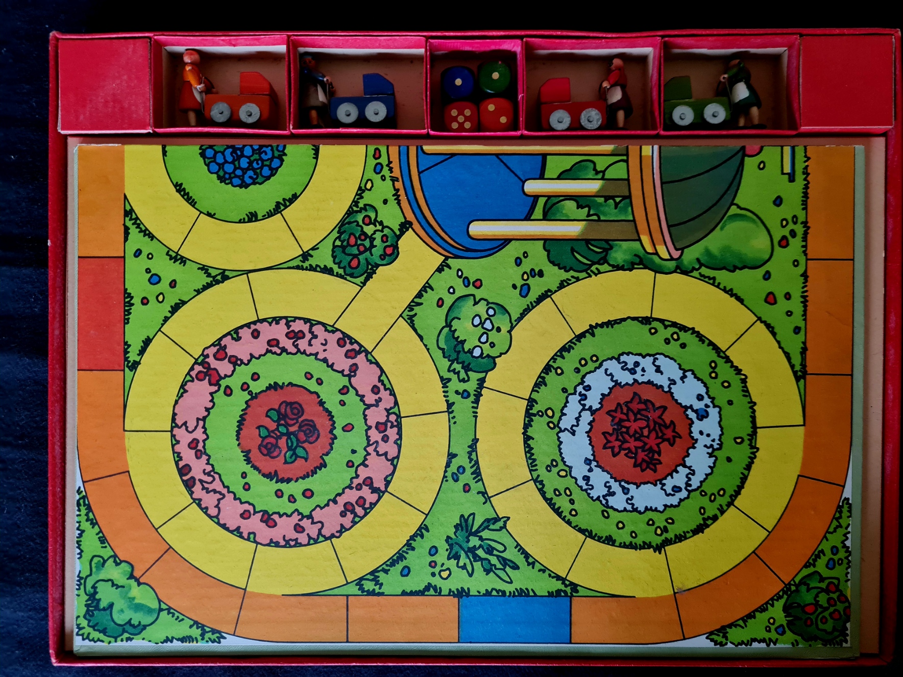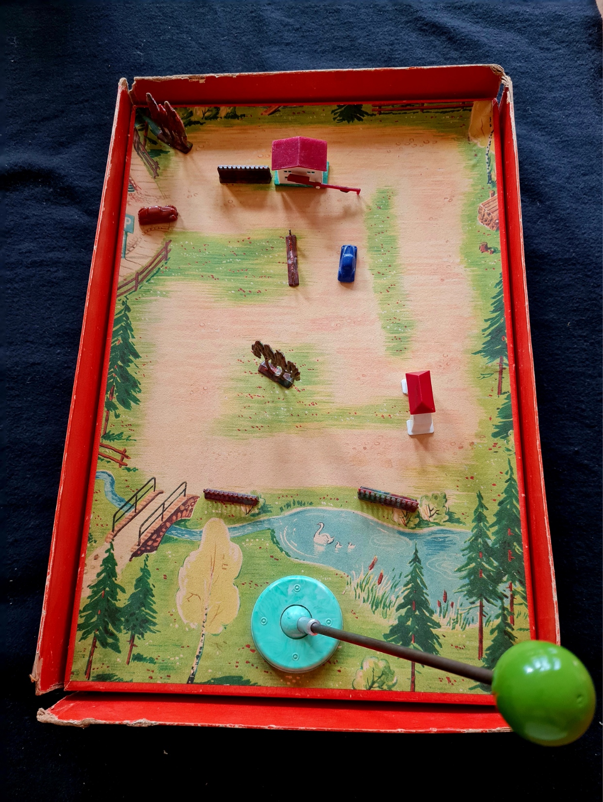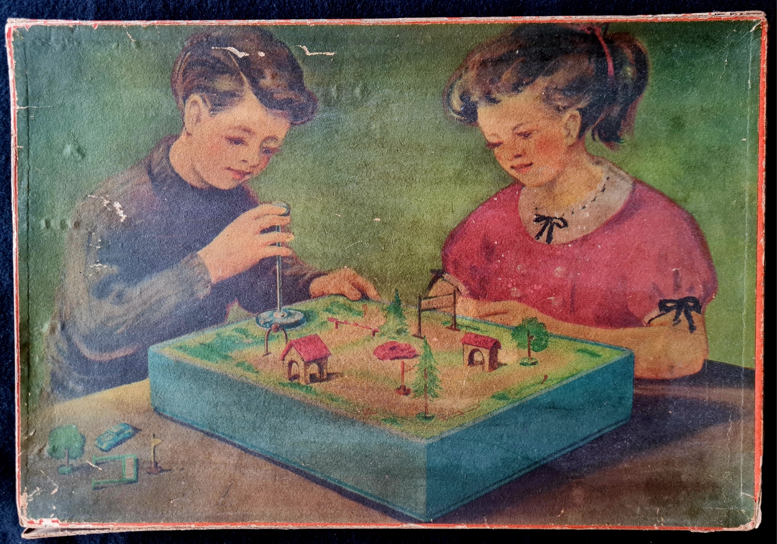 Die Möblierung der Landschaft mit Häusern, Bäumen etc. auf dem Deckel der Spieleschachtel unterscheidet sich doch deutlich von der auf der Spielfäche aufgebauten. Die dabei verwendeten Häuser und Bäume weisen eher auf die Verwendung von Material der PERMA-Magnetspiele bzw. aus der separat erhältlichen Liliput - Die kleine Spielzeugschachtel.