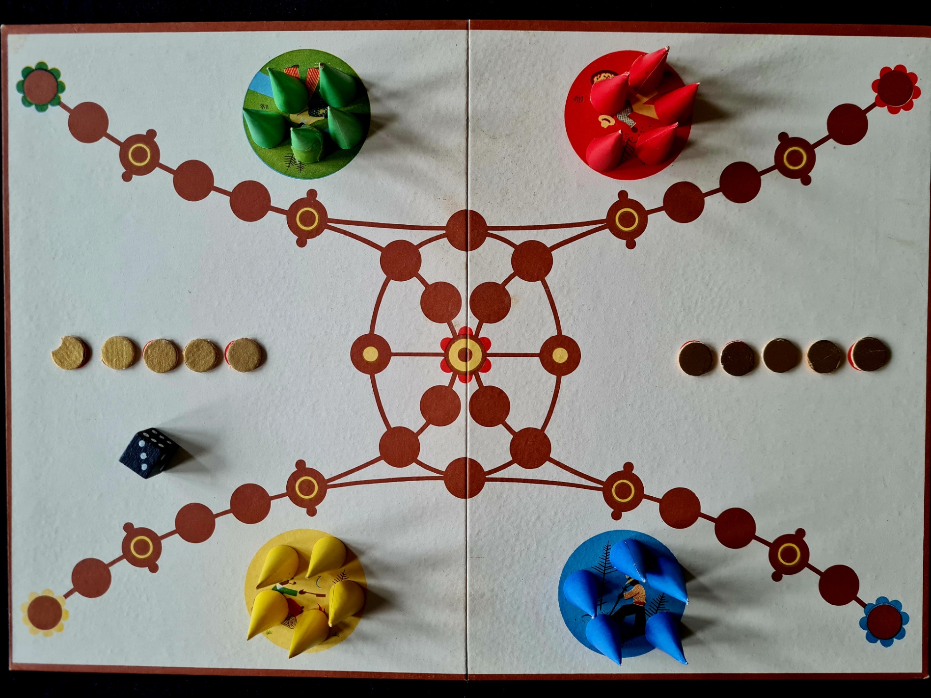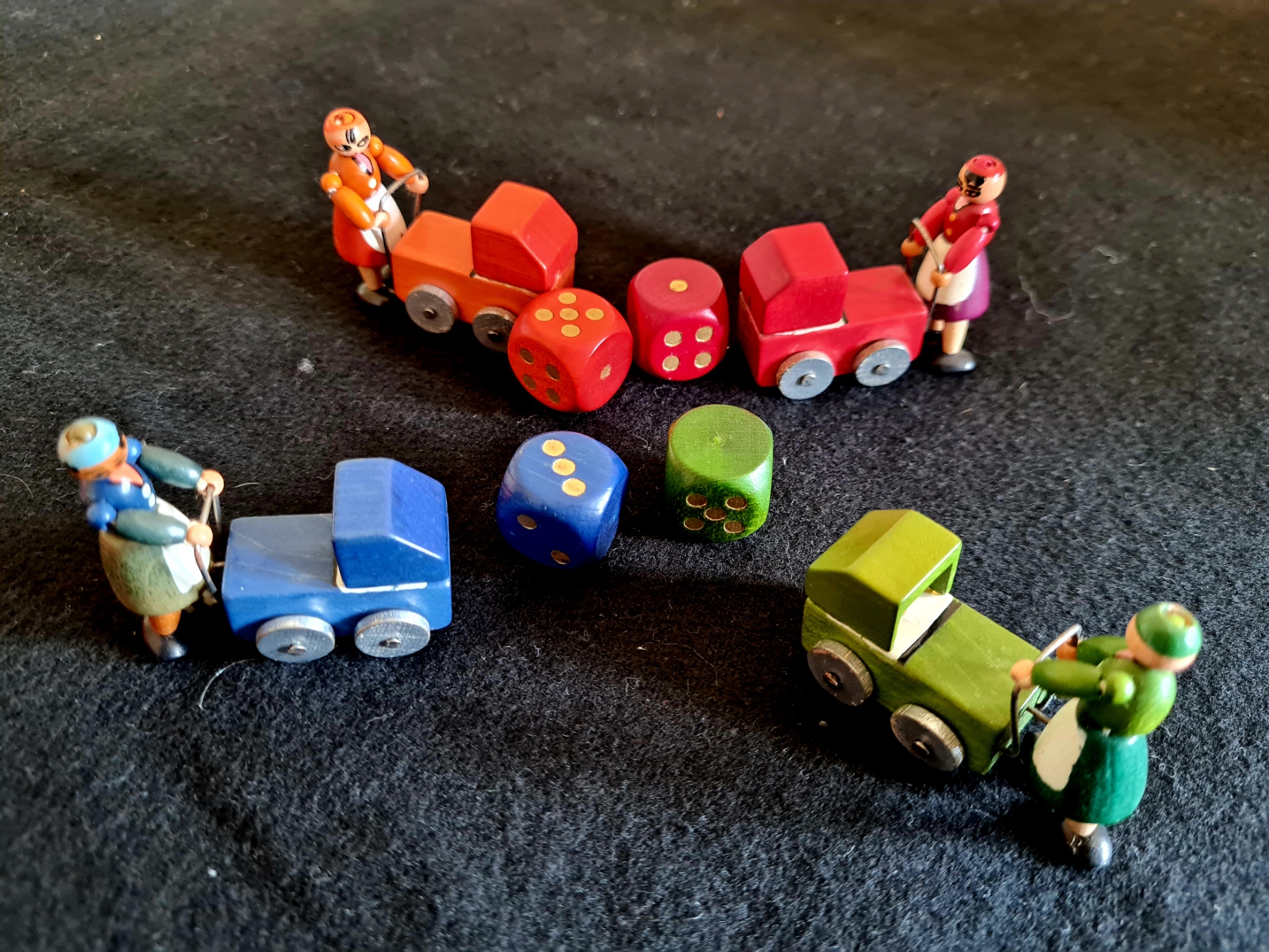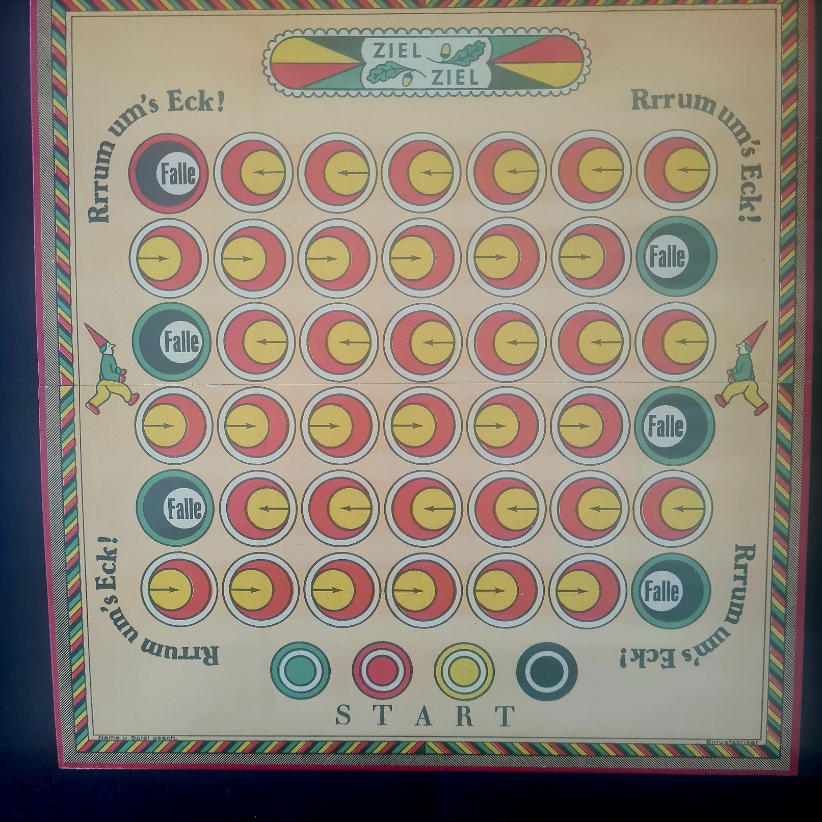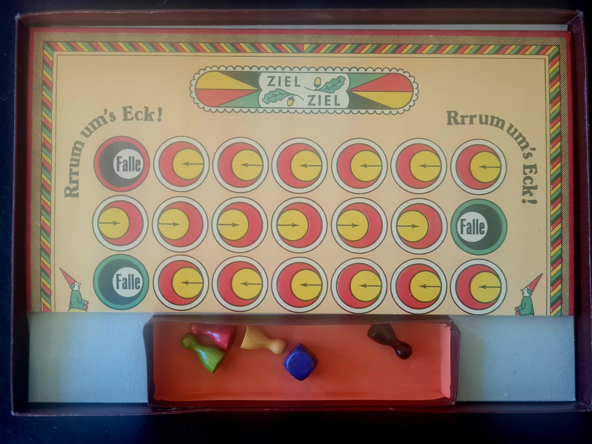 Ein Laufspiel für 2 bis 4 Personen mit Ähnlichkeit zu Mensch ärgere dich nicht (ohne taktische Möglichkeiten) und vielleicht noch mehr Ärgerpotential. Das Spiel ist vollständig und sehr gut erhalten.